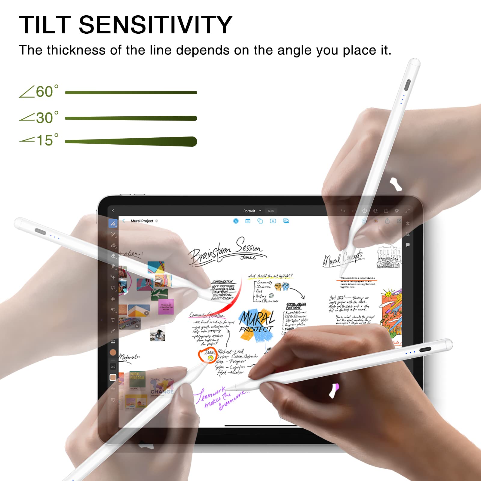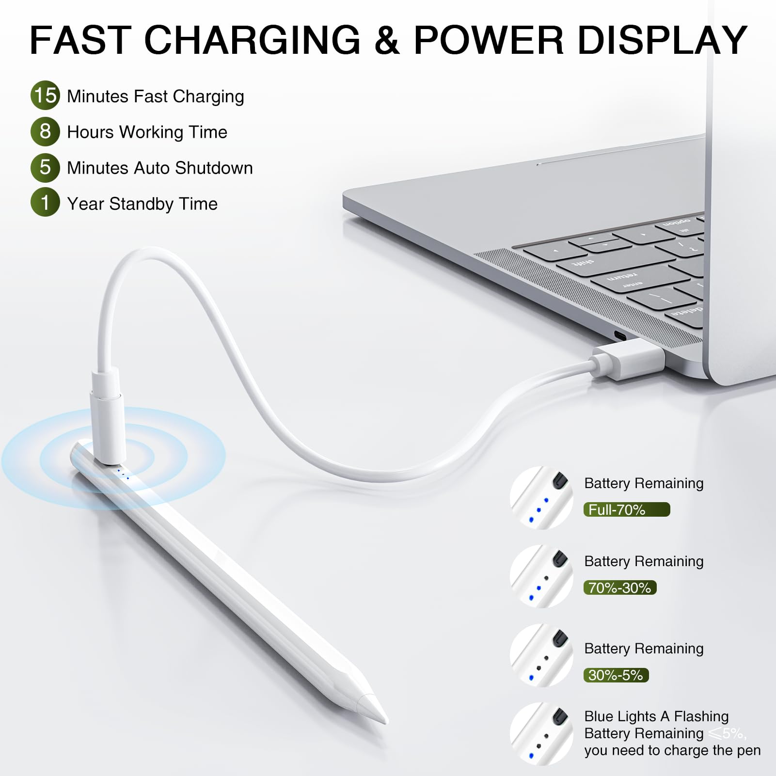 • FAST CHARGING AND MAGNETIC ADSORPTION –– Unlike other older models where it takes hours to be fully charged, our pencil for ipad has a new, improved battery that allows up to 8 hours of writing and drawing time on a full charge in 15 minutes. It also attaches to the side of your iPad so you can't lose it. (Note: Magnetic suction only works with ipad pro 12.9' 3rd/4th/5th, ipad pro 11'/13', ipad Air M2/M3/4th/5th, ipad mini 6).