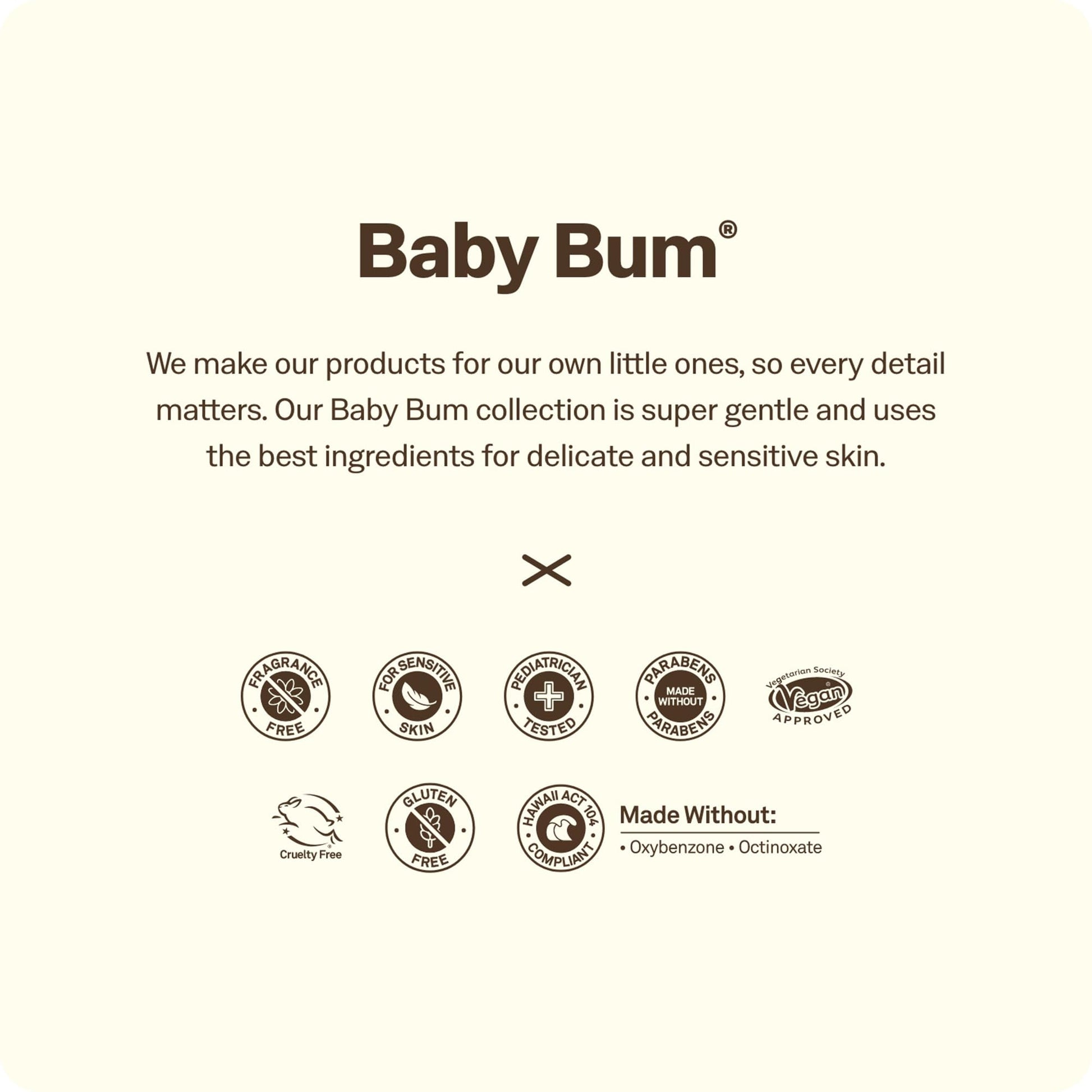 • BABY BUM SPF 50 SUNSCREEN LOTION. Our convenient, travel sized sunscreen is 100% mineral based protection for your little ones. The lotion applies and absorbs easily to face and body with a non-oily feel for UVA/UVB protection.