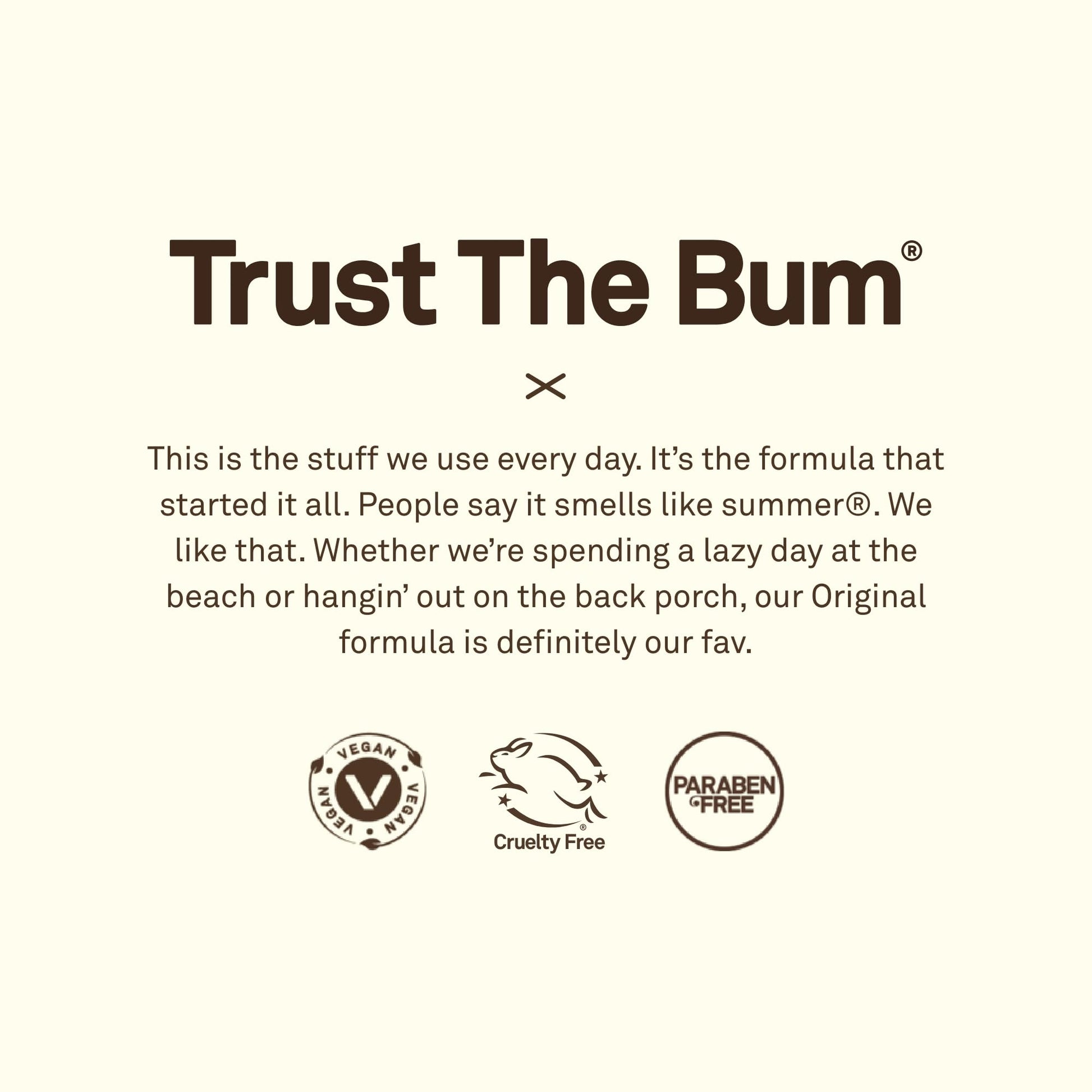 • TRUST THE BUM. What does that mean? It means trust us, the ones who live on the beach and need products that work on the most intense days in the sun. The SIMPLE TRUTH is, when you make products to protect the ones you love, you make 'Em better