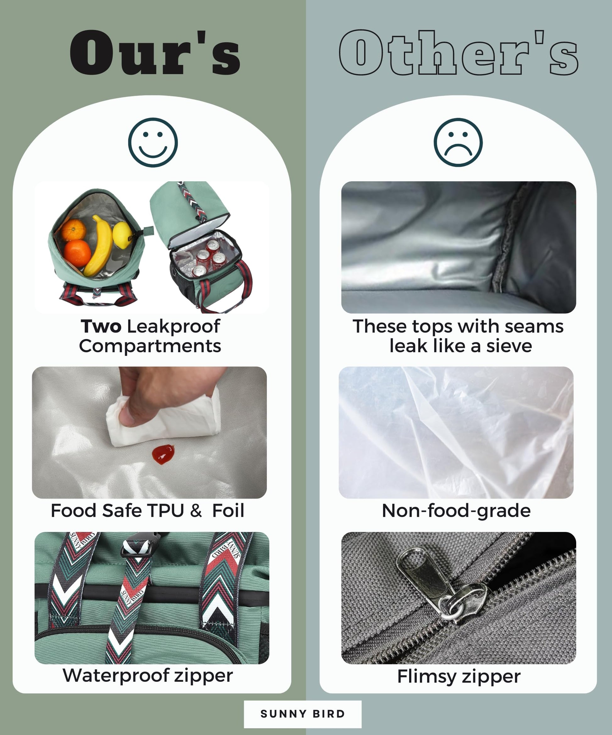 SUNNY BIRD Dual Compartment Lunch Bag Insulated Lunch Box for Women and Men (Green with boho strap)