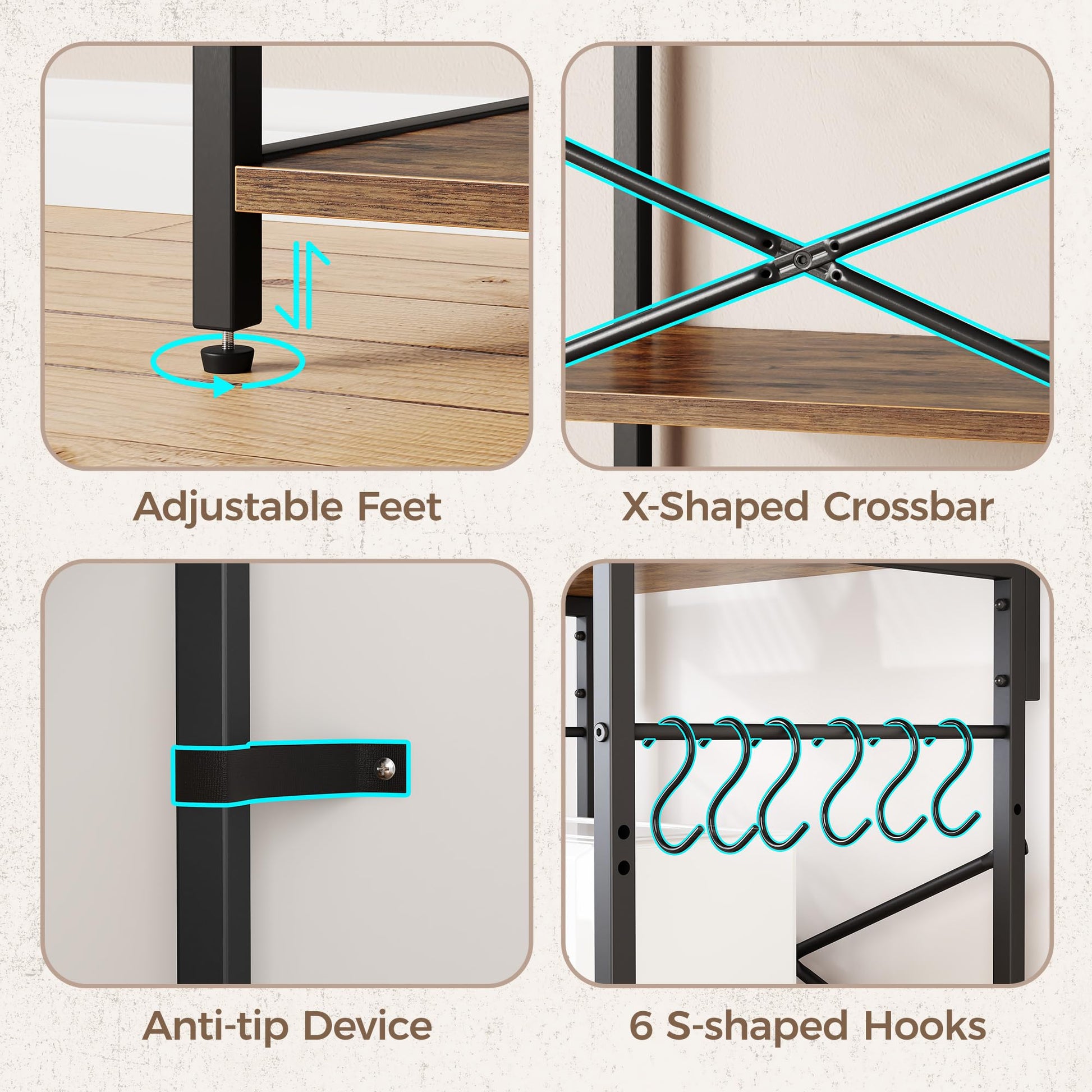 SUPERJARE Kitchen Bakers Rack with Power Outlet, Coffee Bar Table 4 Tiers, Kitchen Microwave Stand with 6 S-shaped Hooks, Storage Shelf Rack for Spices, Pots and Pans - Rustic Brown