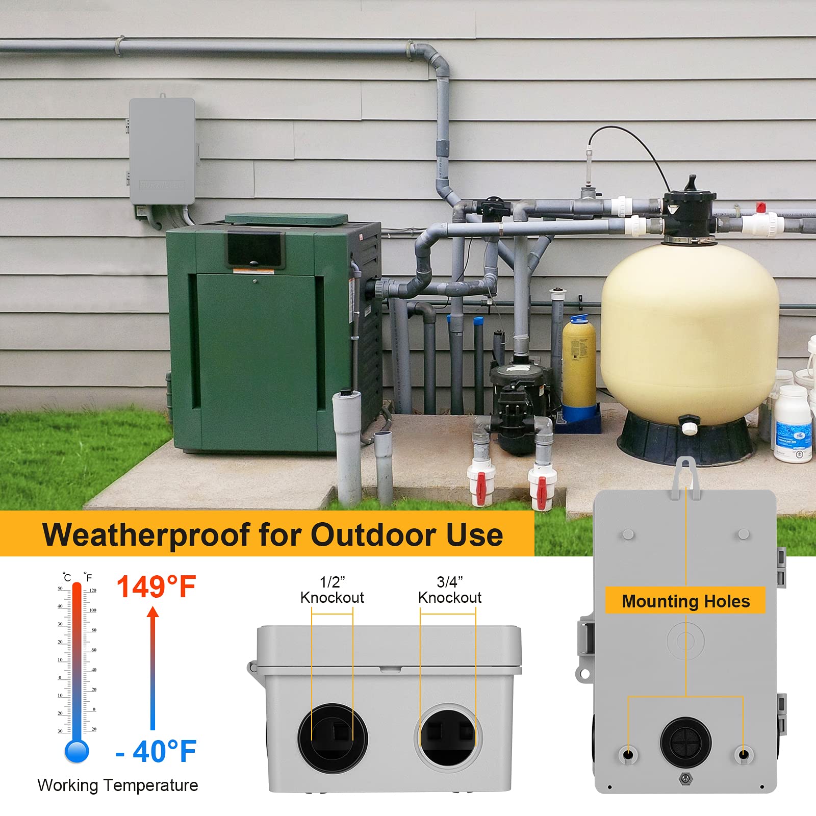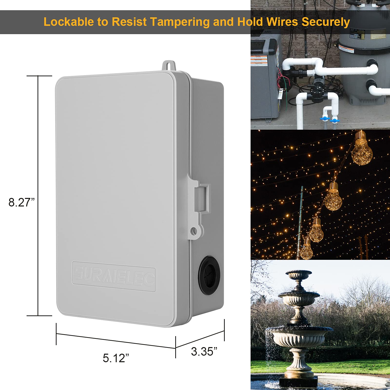 • Weatherproof for Outdoor Use: Designed with raintight and rust-proof materials; This 240v timer switch is protected by a durable, lockable box cover; Resists moisture, direct sunlight, and tampering; Ideal for outdoor timer applications like pool pump timers and swimming pool timer switches