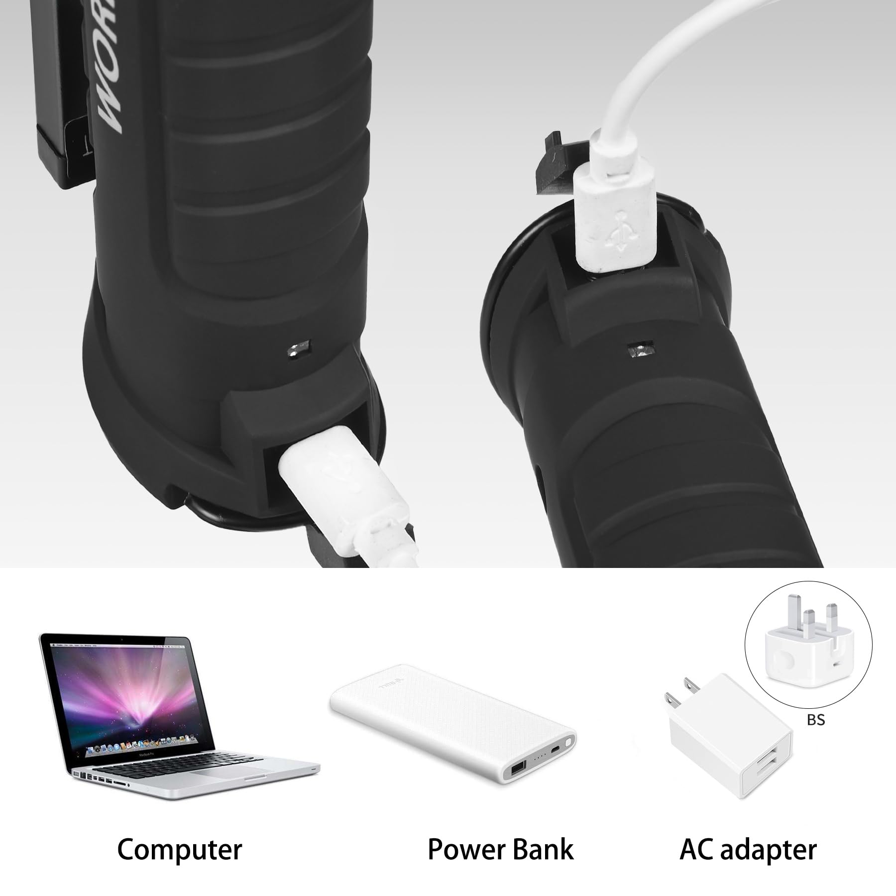 • USB Rechargeable:This rechargeable work light Built-in rechargeable battery, charging by USB port ( included usb cable), you can charging it via power bank, computer and other USB charging device. It can work long time on High light modes. The indicate light can show the charging or full charging.