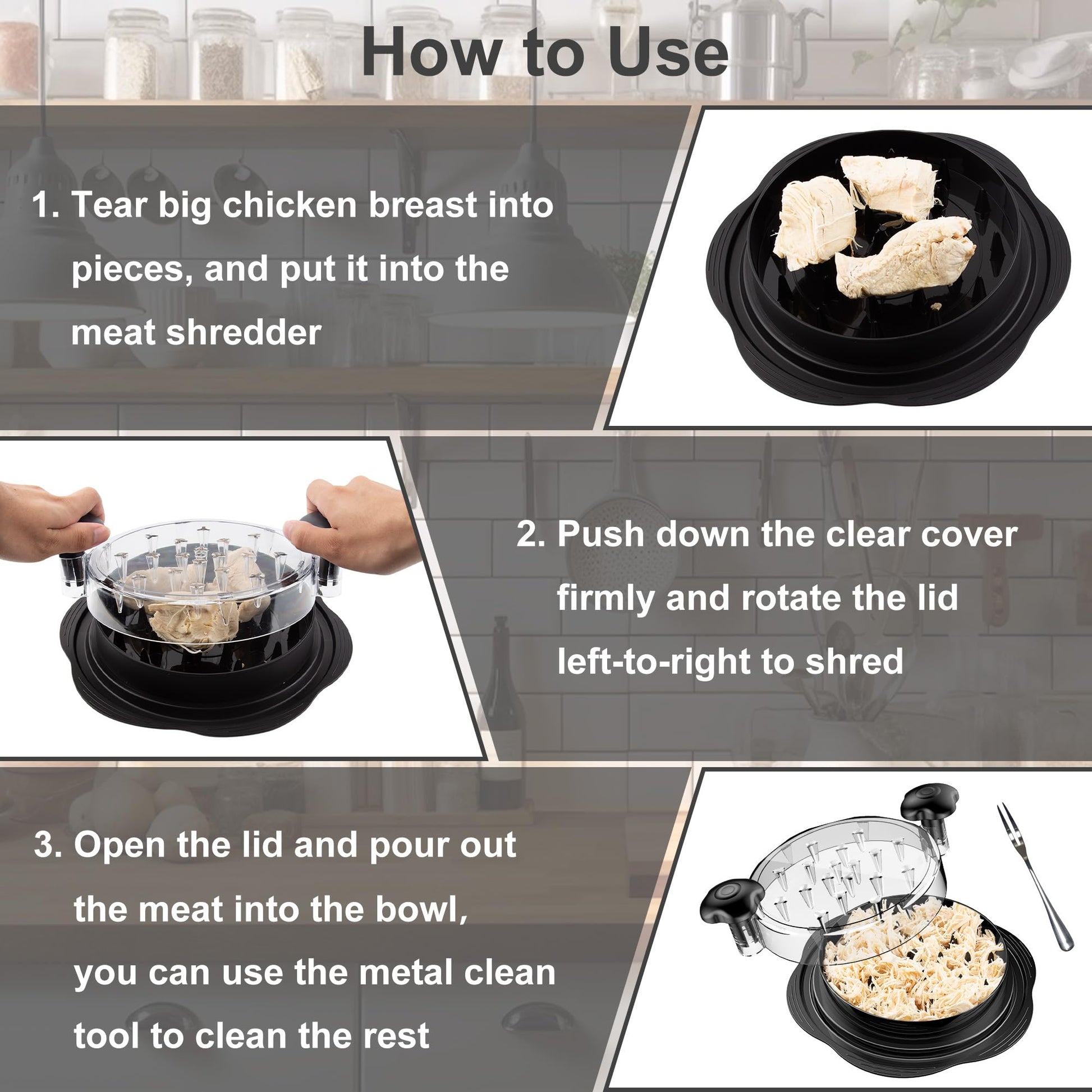 • HOW TO USE: We need to cook meat first and cut it into small pieces, forbid using raw meat to shred it, as it will damage the spike. The small pieces can be divided into 3 parts to put on the shredder, which can shred the meat finely and evenly. If you need different shredding states, you can twist it many times to get it. When its state is finished through visible clear lid, you can open the cover and put the meat into the bowl to make your delicious food