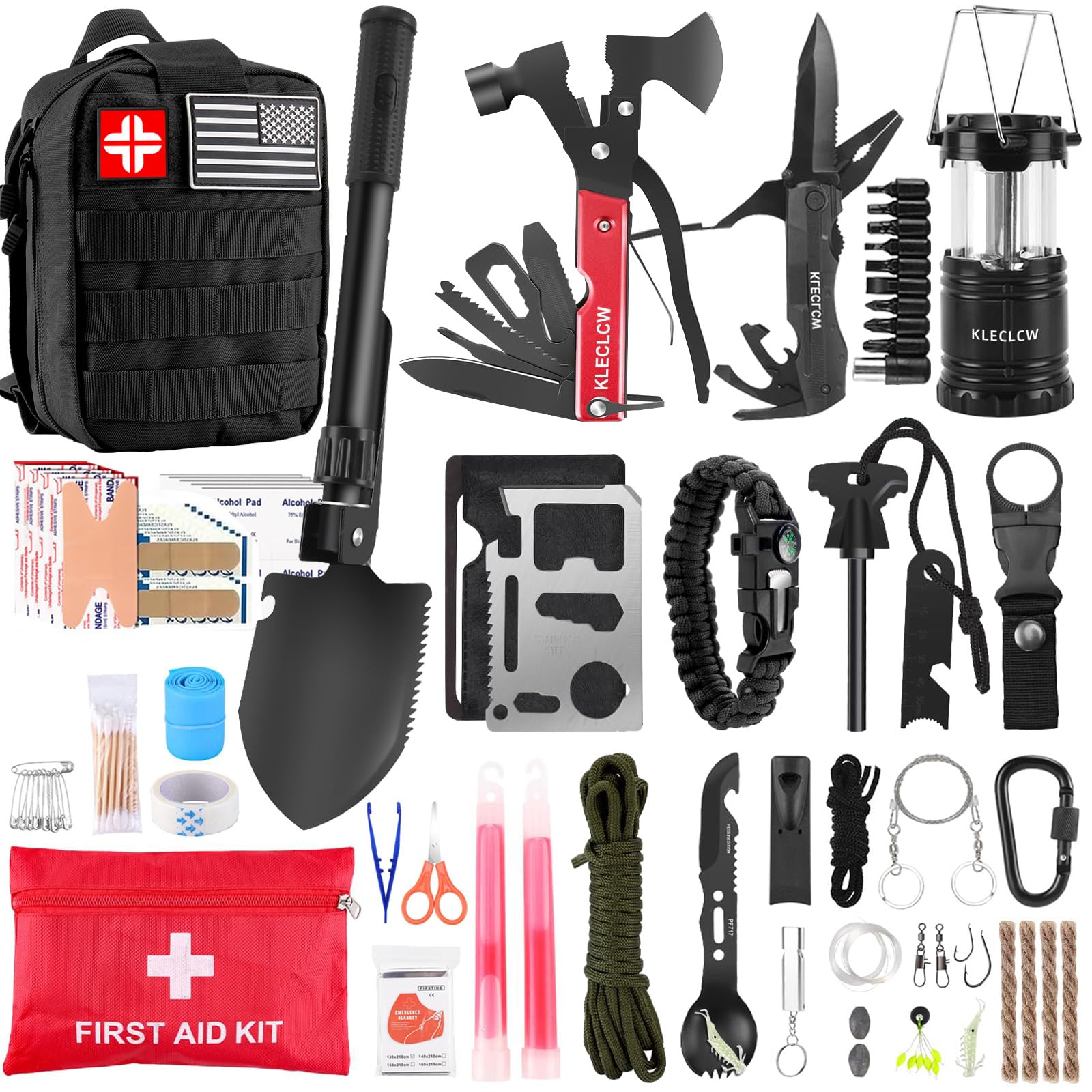 • 【Practical Camping Tools and Tactical Gear】We upgraded the survival kit, added several camping accessories, such as 15 in 1 axe, 4 in 1 folding shovel, 10 functions pocket pliers and an tent lantern. In addition, there are multifunctional card, survival bracelet, fire starter, light stick, climbing hook, wire saw, parachute cord, emergency blanket, multi-use spoon, bottle hanging buckle, which can meet your different needs. This practical tool set would be best Christmas gift for man woman.