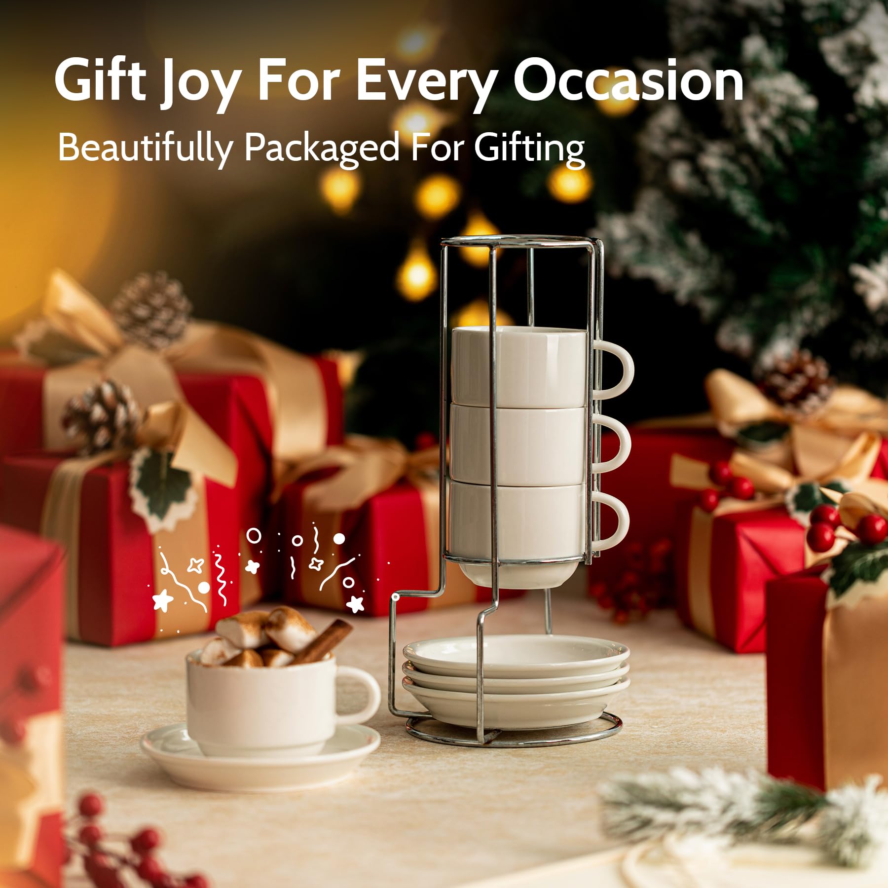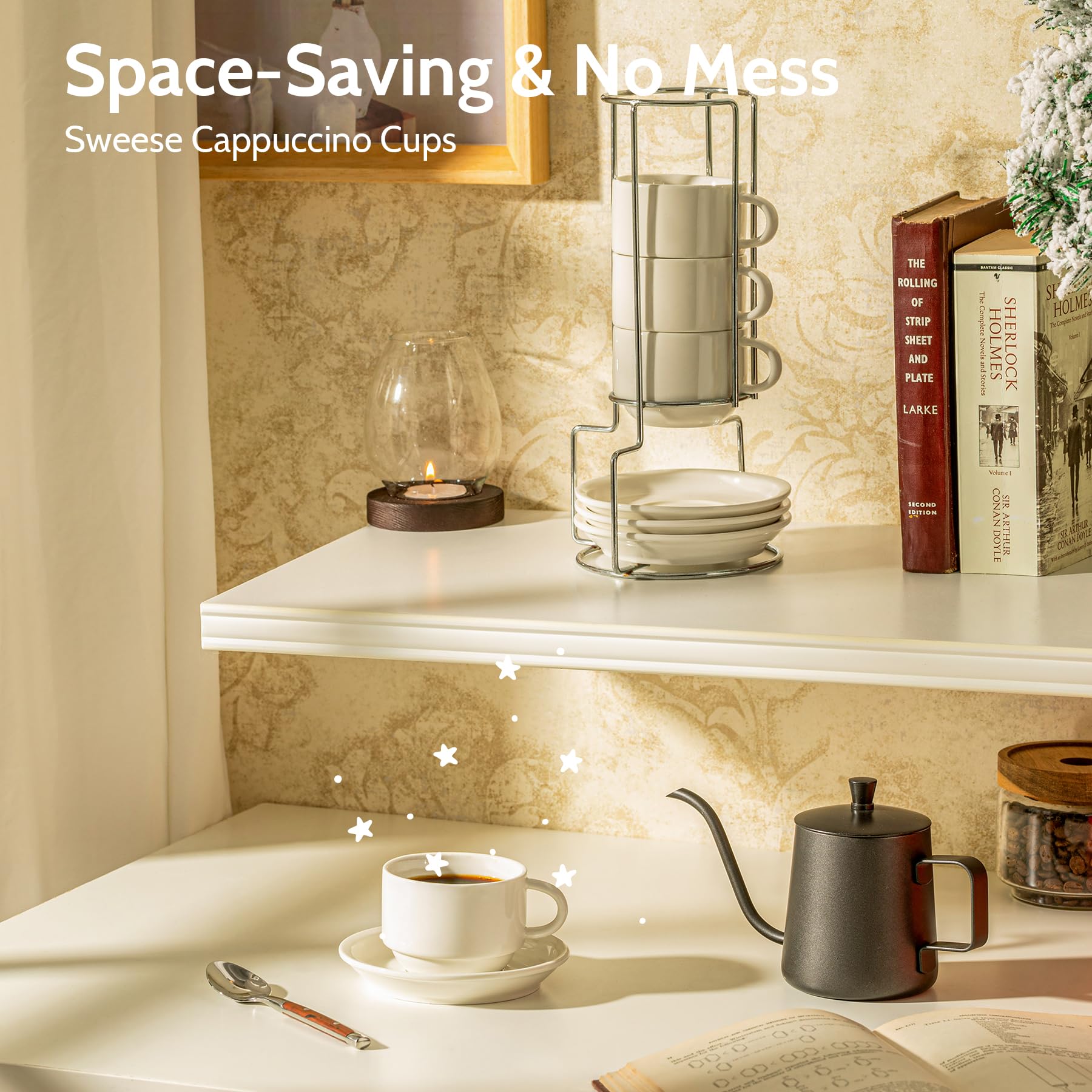 Sweese 8 Ounce Porcelain Stackable Cappuccino Cups with Saucers and Metal Stand - for Specialty Coffee Drinks, Cappuccino, Latte, Americano and Tea - Set of 4, White