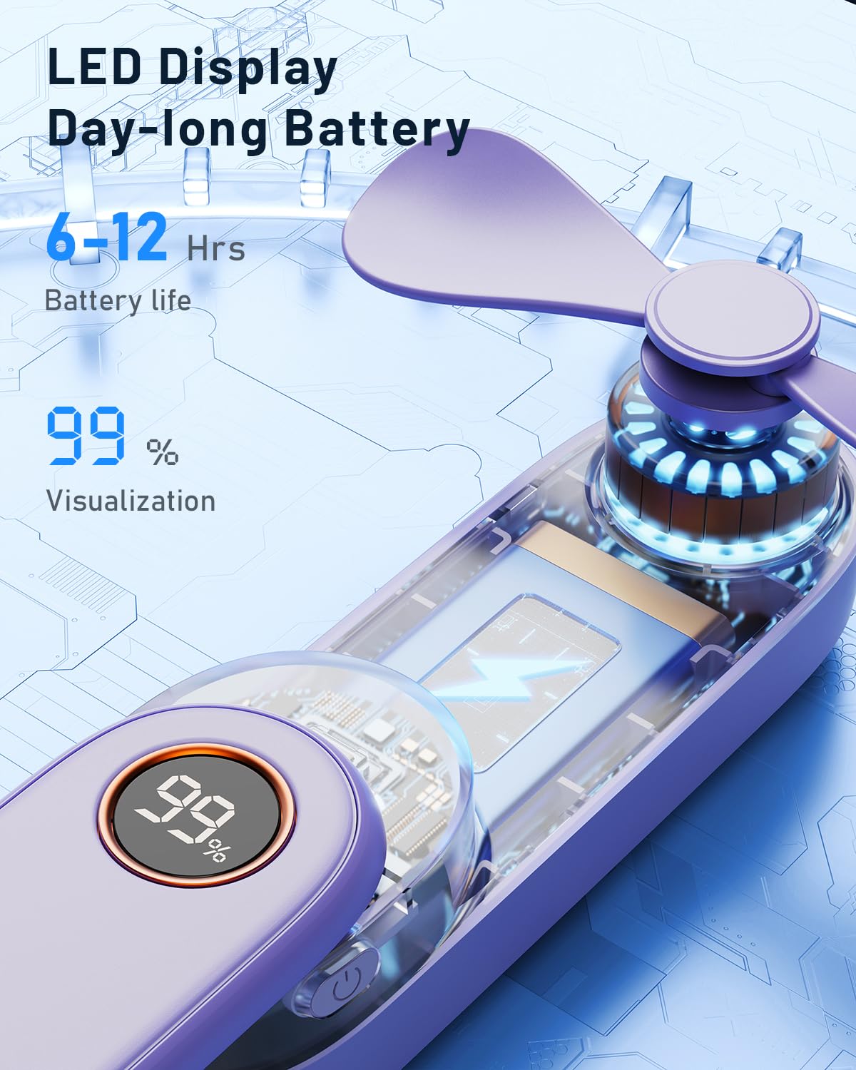 • [6-12 Running Hrs & LED Display] This small fan features a rechargeable battery, offering extended runtime and real-time battery level monitoring through its LED display —an ideal gift for girls, moms, and women.