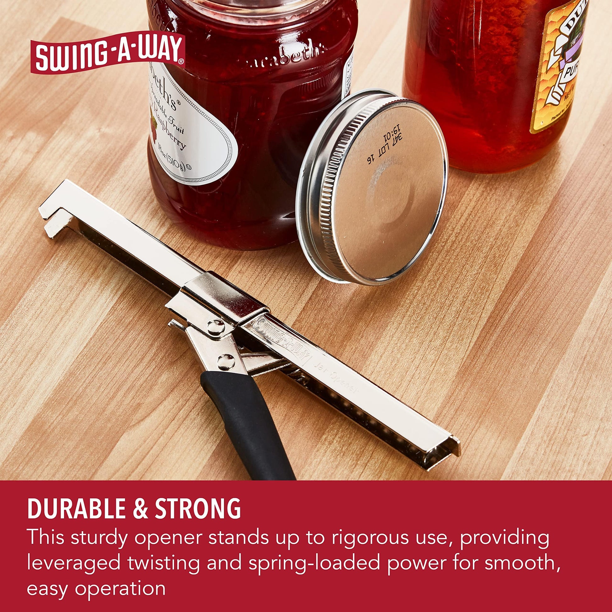 Details: 'Since 1938, Swing-A-Way has been a trusted name for durable and dependable can openers. This Comfort Grip Jar Opener is an essential addition to your kitchen tools. It easily opens stubborn jar lids and caps with its sharp cutting wheel and spring-loaded mechanism, providing smooth and effortless operation. The opener's adjustable design fits most food lids and jar sizes, making it versatile for various kitchen tasks. Constructed from high-quality, rust-resistant stainless steel, this opener is built to last. Its ergonomic design includes a soft, cushioned grip that ensures comfortable handling, even for extended use. The non-slip handle provides a secure grip, reducing the effort required to open jars. Ideal for all ages, including seniors and those with arthritis, this can opener offers a pain-free experience with its smooth-operation mechanism. This compact and lightweight jar opener is not only practical but also easy to clean—hand wash with warm water and a mild detergent, then rinse and dry immediately. Whether you're opening jars, cans, or bottle caps, this versatile kitchen gadget is an essential tool for any home.'