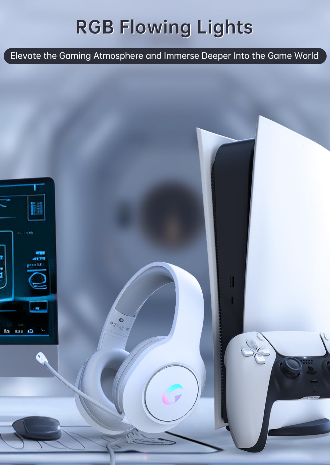 syndesmos CM7002 Gaming Headset for PS5, PS4, PC, Mac, Switch, Xbox Series, Surround Sound RGB Gaming Headphones with Noise Canceling Microphone, 50MM Dynamic Drivers, 3.5MM Audio Jack, Light White