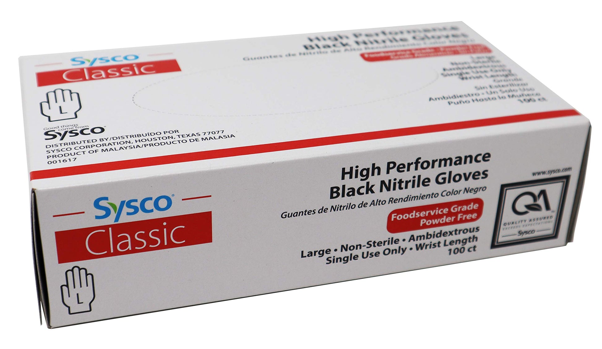 Details: Sysco High Performance Black Nitrile Gloves. Large, Non-Sterile, Ambidextrous, Single Use Only, Wrist Length. Available in small, medium, large & X-large.