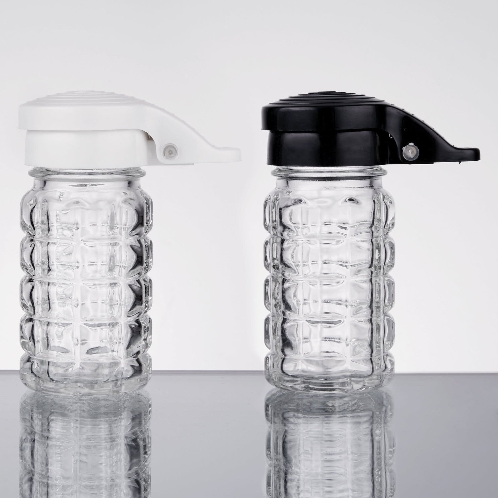 Details: Give your diner or restaurant a classic look with the Tablecraft 1.5 oz. salt and pepper shakers. These shakers feature a clean, bubbled glass design and include both black and white moisture proof ABS top, perfect for efficiently storing and serving salt and pepper. The moisture proof tops keep humidity out, making them a must have for all establishments with outdoor service. Additionally, the clear glass body allows for easy product visibility to ensure your establishment can save money by minimizing test pours. The clear glass also makes it easy to see when salt and pepper levels are getting low and need a refill. These shakers feature a hinged lid so that they close immediately after use to help keep moisture and contaminates out of the container. Regardless of where you use them, these shakes are ideal for easy cleanup and refilling. Features 163MPBK and 163MPW glass shaker.