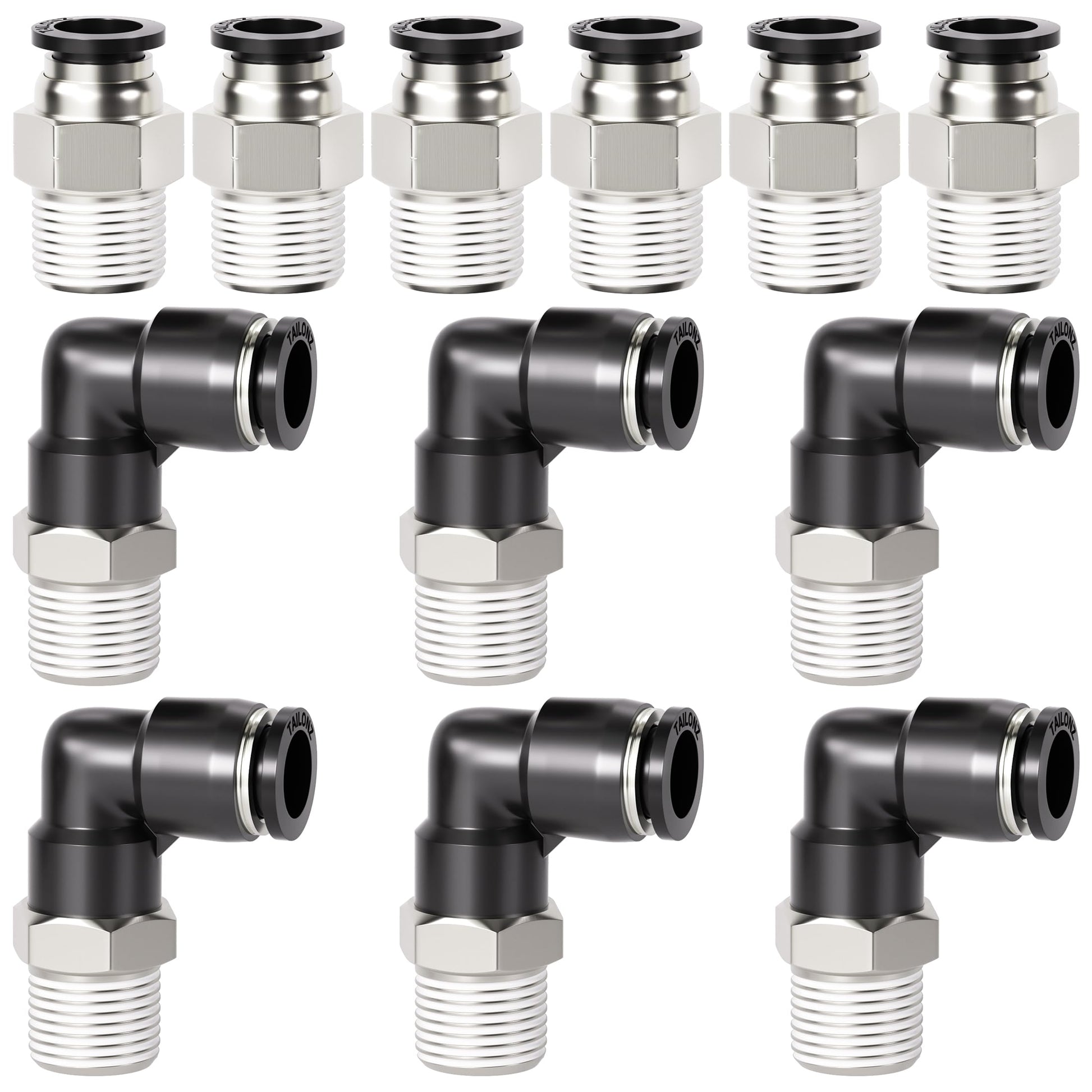 TAILONZ PNEUMATIC Elbow and Straight Combination 1/4 Inch Tube OD x 1/4 Inch NPT Thread Push to Connect Fittings PC-1/4-N2+PL-1/4-N2(Pack of 12)