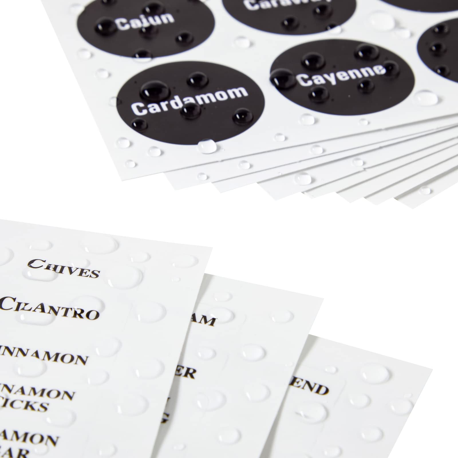 • Customizable Spice Labels: Enhance the organization of your kitchen containers with preprinted, water-resistant vinyl labels. These labels fit perfectly on your spice jars with labels, covering a wide array of common herbs and spices
