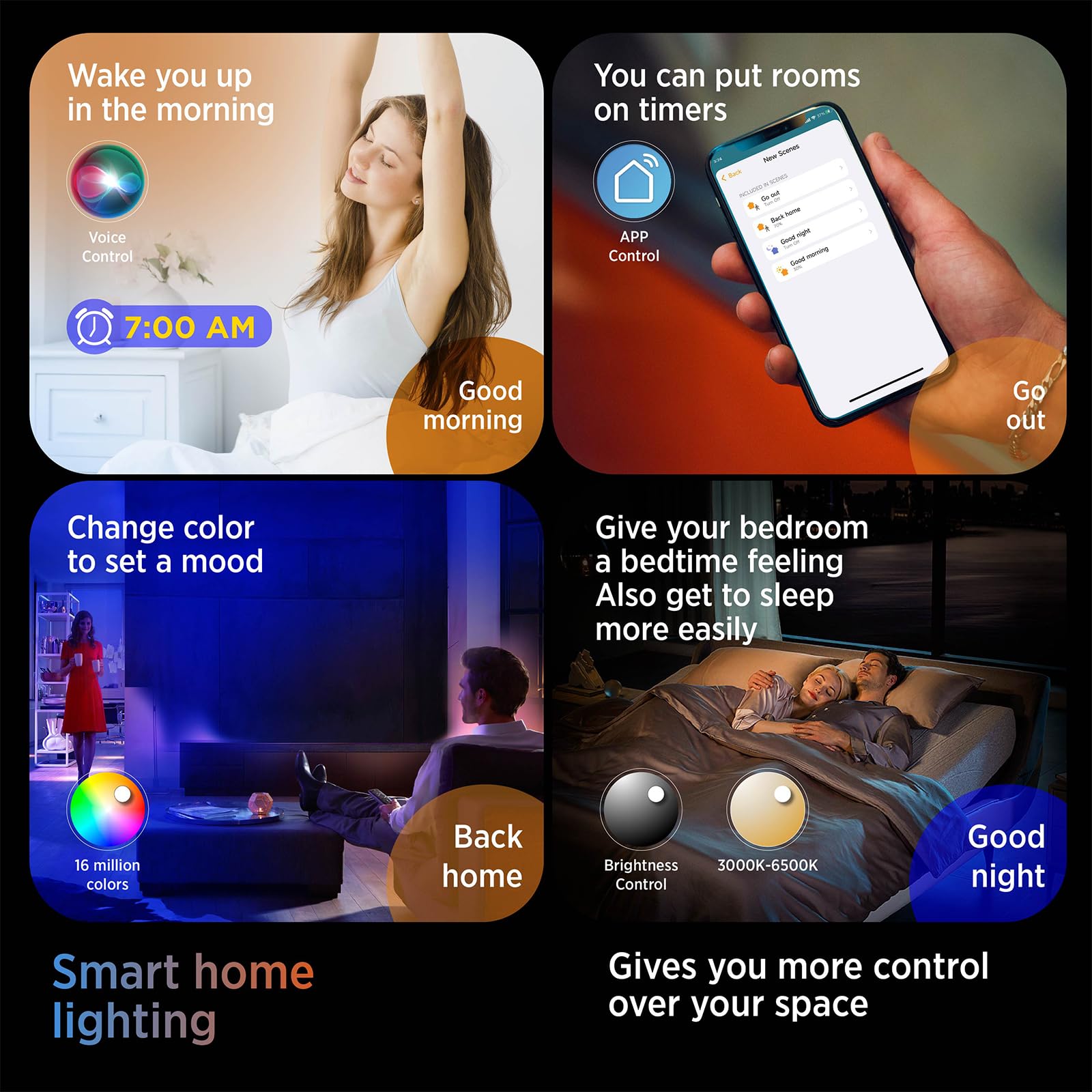 • 【5- Back light RGB Color】Only 4Watt power, energy saving. It’s like an ambience light with full RGB color changeable. Each color’s brightness could also be dimmable by APP or ALEXA. It is very fit for baby’s room while they feel scary sleeping alone at the dark night. User could only turn on the back light and choose one of their favorite colors by cellphone APP or ALEXA.