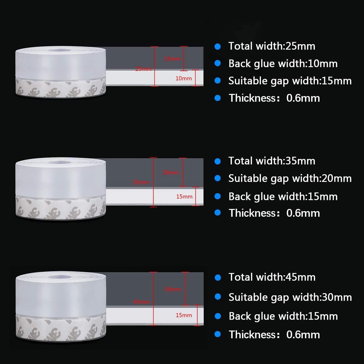 • 【Width Selection】The total length of the sealing strip is 16 feet, thickness of 0.02 inch and can be cut to your needs. A gap of 0-15mm is recommended to select a 25mm width seal; a 0-20mm gap is recommended to select a 35mm width seal; a 0-30mm gap is recommended to select a 45mm width seal.