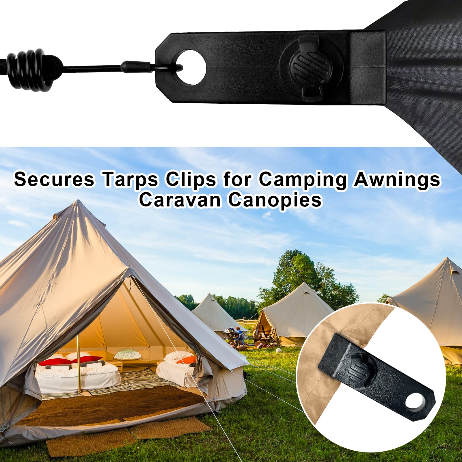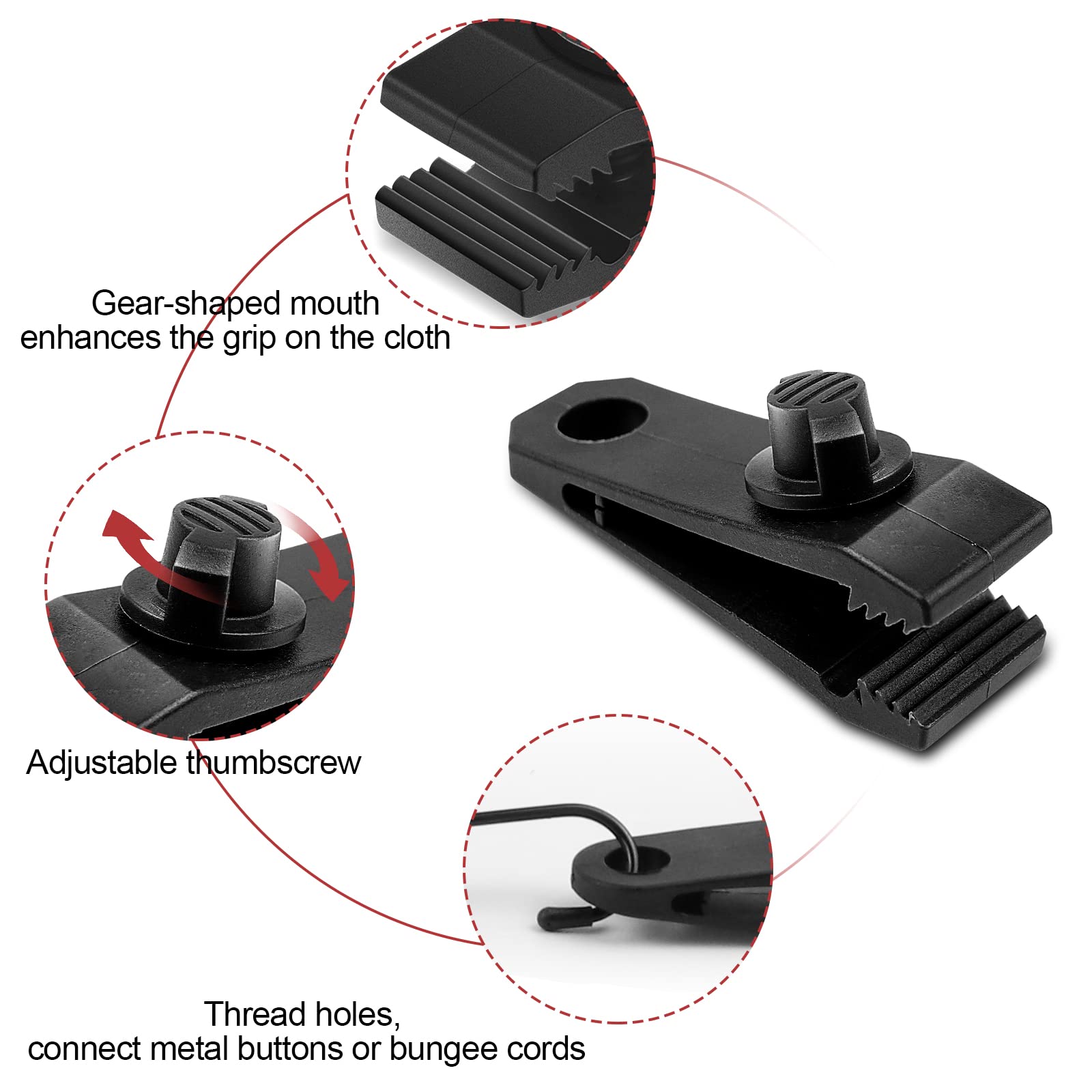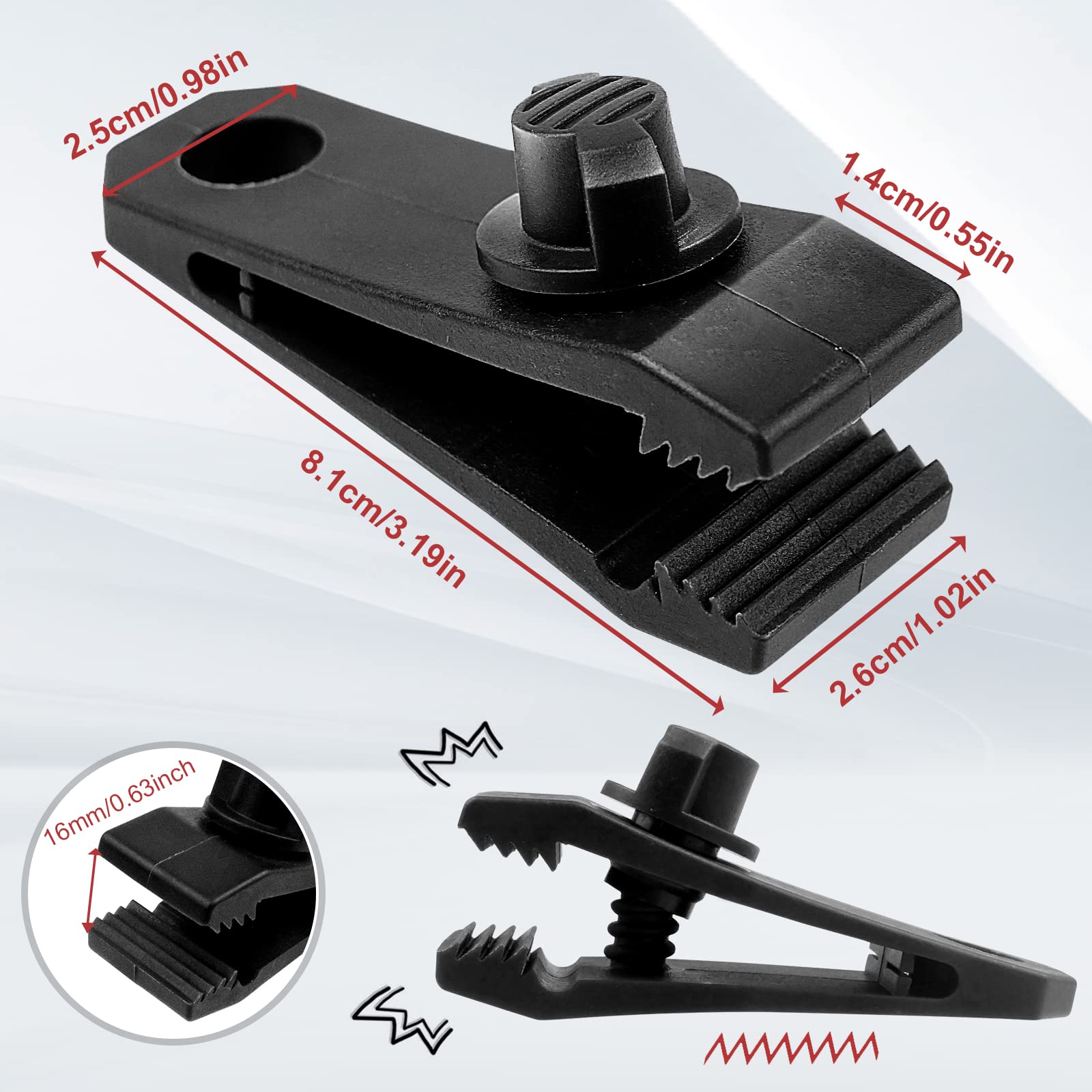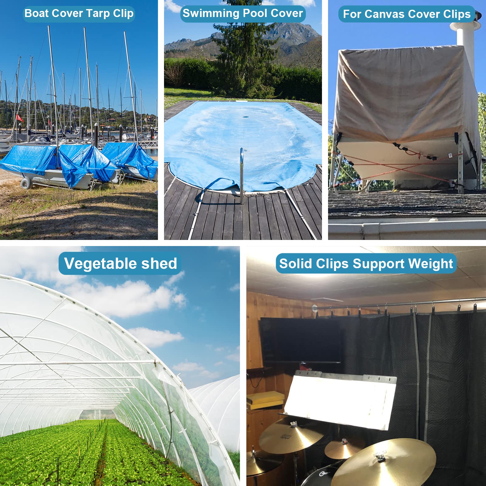 • 【Wide Applications】: The tent Clamps are ideal for holding up tarp, canopy, boat cover, rainfly, bike cover, car/truck cover, pool cover, swimming pool covers, temporary shelters or any fabric covering that requires additional support points