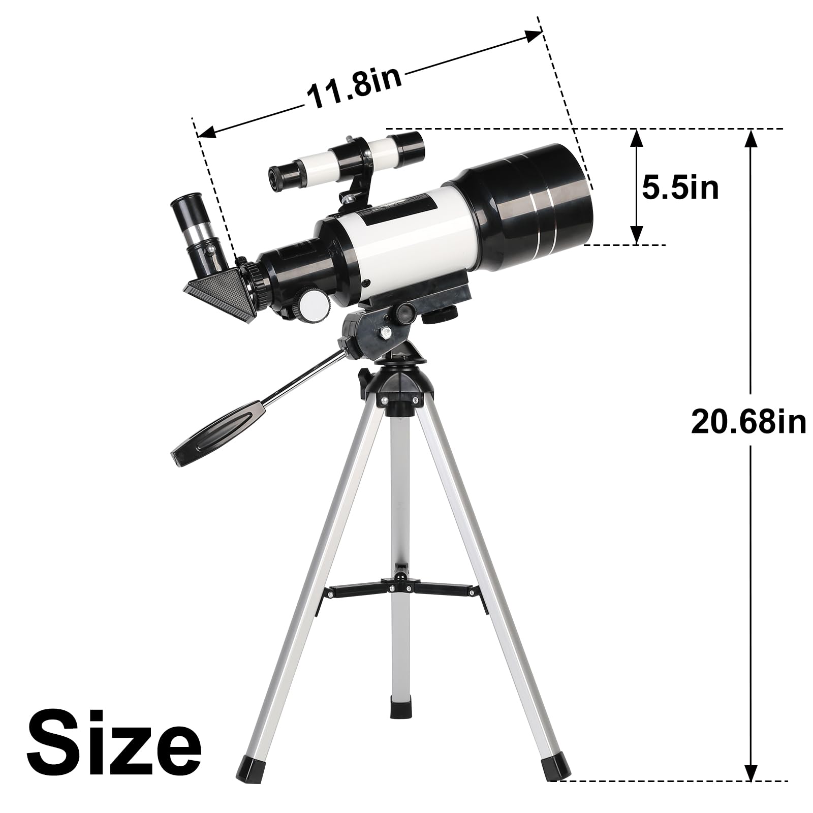 • 【70mm Large Aperture】The telescope equipped with 70mm aperture and 300mm focal length, which provide more lights and clearer images, even beginners can get clear images. The bigger the aperture, the bigger the field of vision, and the clearer the image.