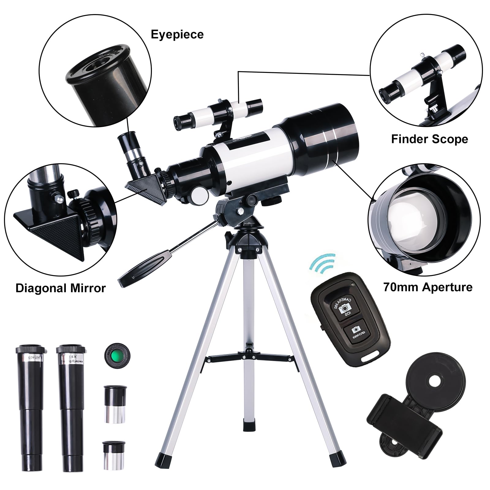 Telescope for Adults & Kids, 70mm Aperture Refractor (15X-150X) Portable Travel Telescope with Phone Adapter & Wireless Remote, Astronomy Beginners Gifts, Black