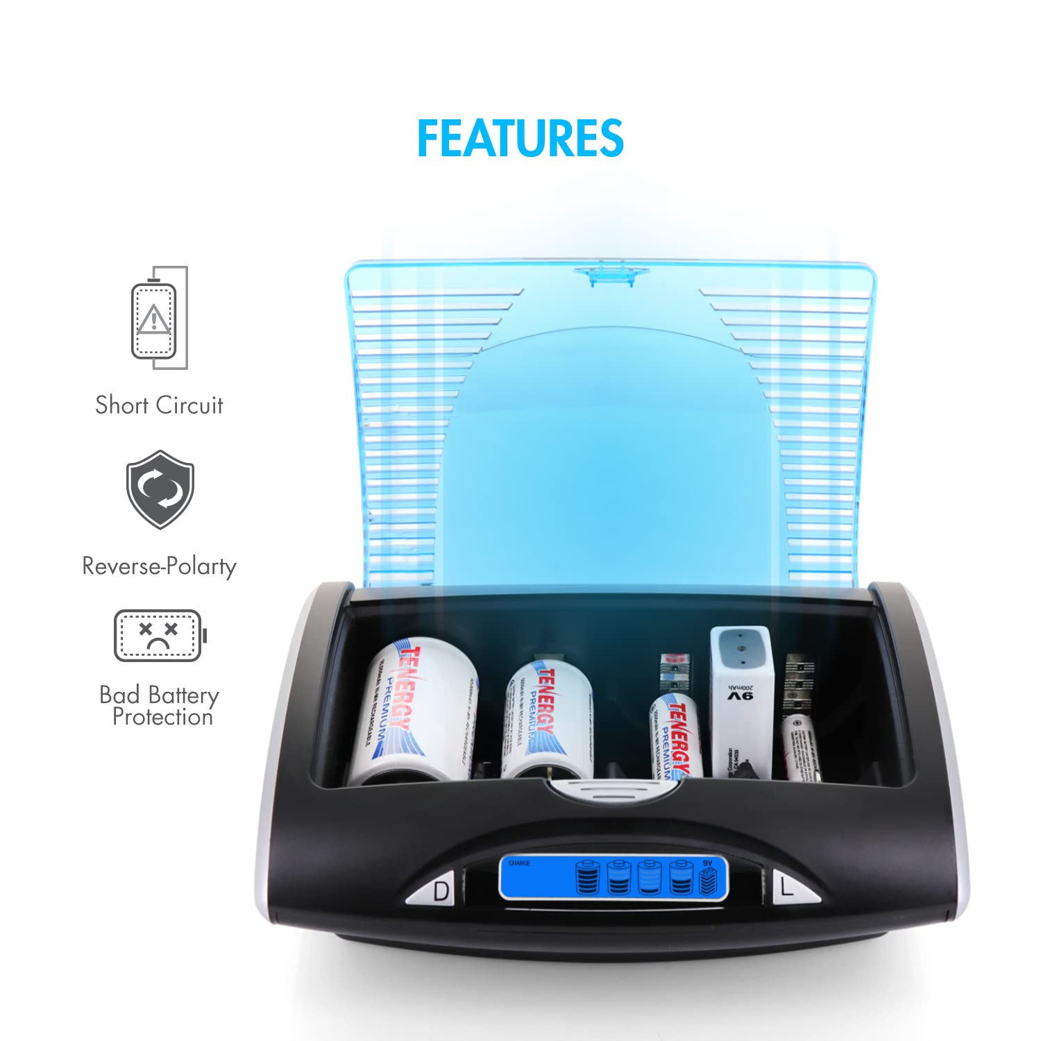 • Large LCD screen - The backlight LCD universal household battery charger provides clear notifications for the current battery status. Individual battery icons display capacity level, battery charging, discharge, full, or bad battery. Never guess when your batteries are fully charged and ready to be used.