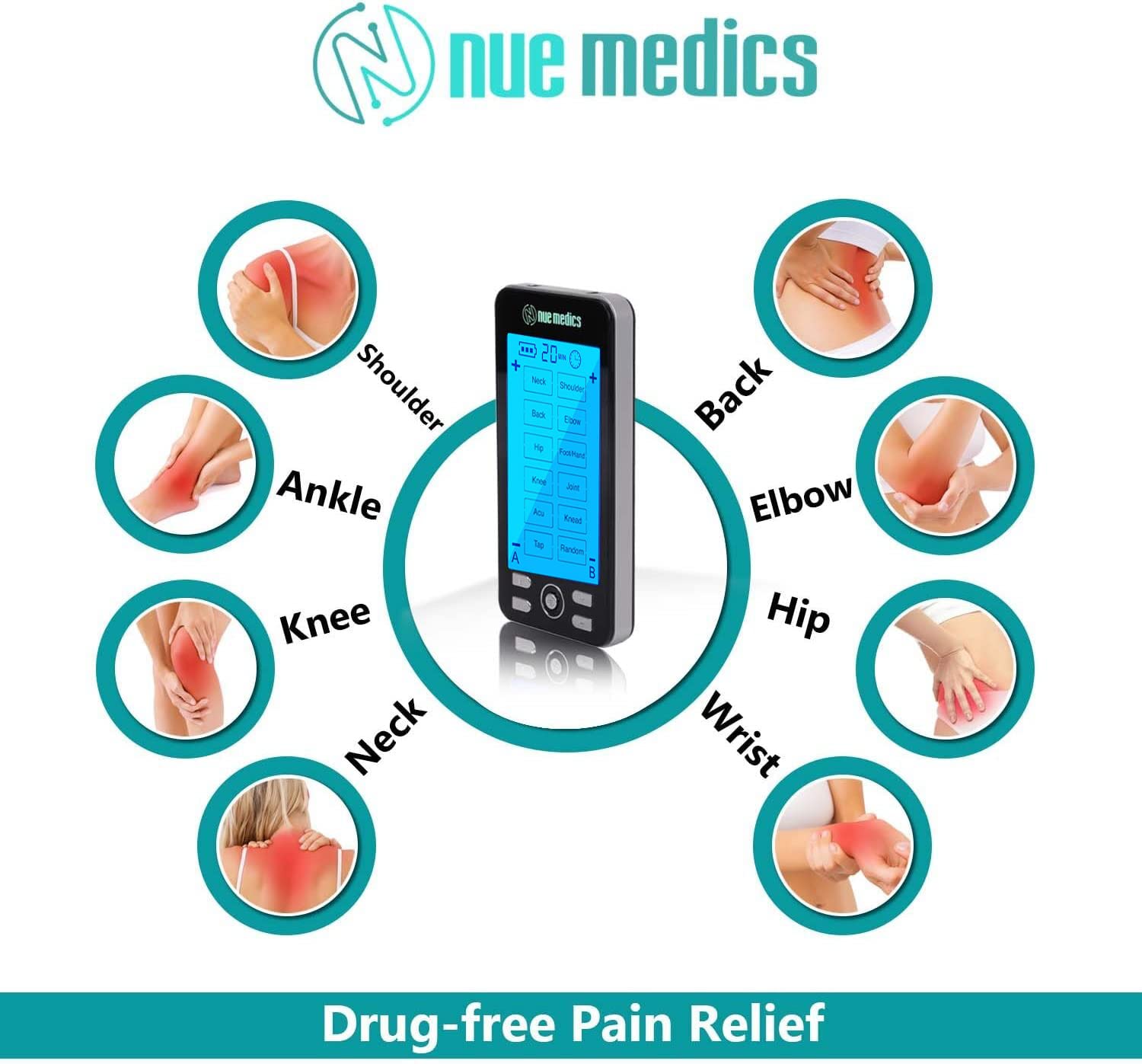 • USER FRIENDLY: NueMedics Tens 24 works on 'Neck','Shoulder','Back', 'Elbow', 'Hip', 'Foot/Hands', 'Knee', 'Joint', 'Acu', 'Knead', 'Tap' and 'Random'. No matter where your pain is, the source of your relief is gathered in one device. As a muscle stimulator, this product offers a large LCD Display and 2 A-B outputs which allows you to have 2 different messages with different strengths at the same time. This unit features an adjustable timer, battery life indicator, and a built-in lithium battery.