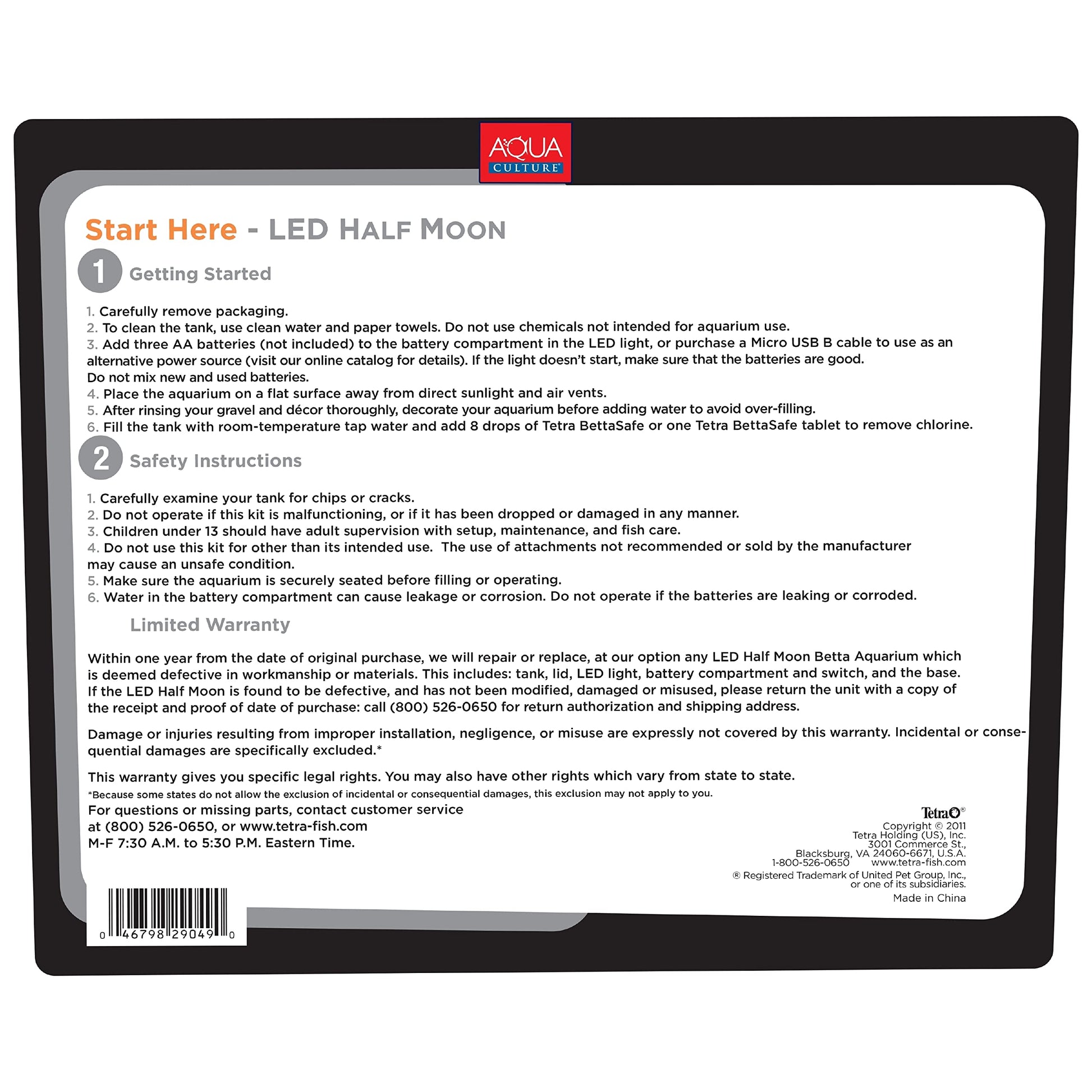 Details: The Tetra® LED Half Moon aquarium kit provides an ideal environment for bettas, with a 1.1 gallon clear plastic tank that features a curved front for unobstructed viewing and a clear canopy with convenient opening for feeding fish. The repositionable LED light can illuminate the aquarium from above or below. The light requires 3 AA batteries (not included) or may be powered by a micro USB B cable with AC adapter (not included). Small aquariums are a great way to get started in the freshwater fishkeeping hobby, and with any new hobby involving living creatures, it is always best to learn as much as you can. When buying fish, ask your retailer for guidance in choosing the right fish for your size aquarium. Since 1951, Tetra has developed the world’s most comprehensive body of fish food knowledge, and fishkeeping enthusiasts have looked to the brand for products and solutions that add ease and beauty to their home. Whether you're an experienced hobbyist or just starting out, Tetra has everything you need – from a large variety of quality fish food and innovative equipment to test kits and decor.