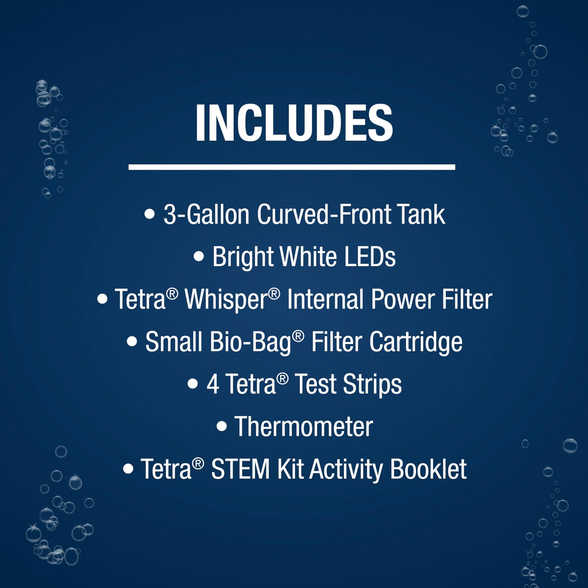 INCLUDED ACCESSORIES: Includes Tetra Whisper Internal Power Filter, small Bio-Bag Filter Cartridge, 4 test strips, thermometer and Tetra STEM Kit Activity Guide.