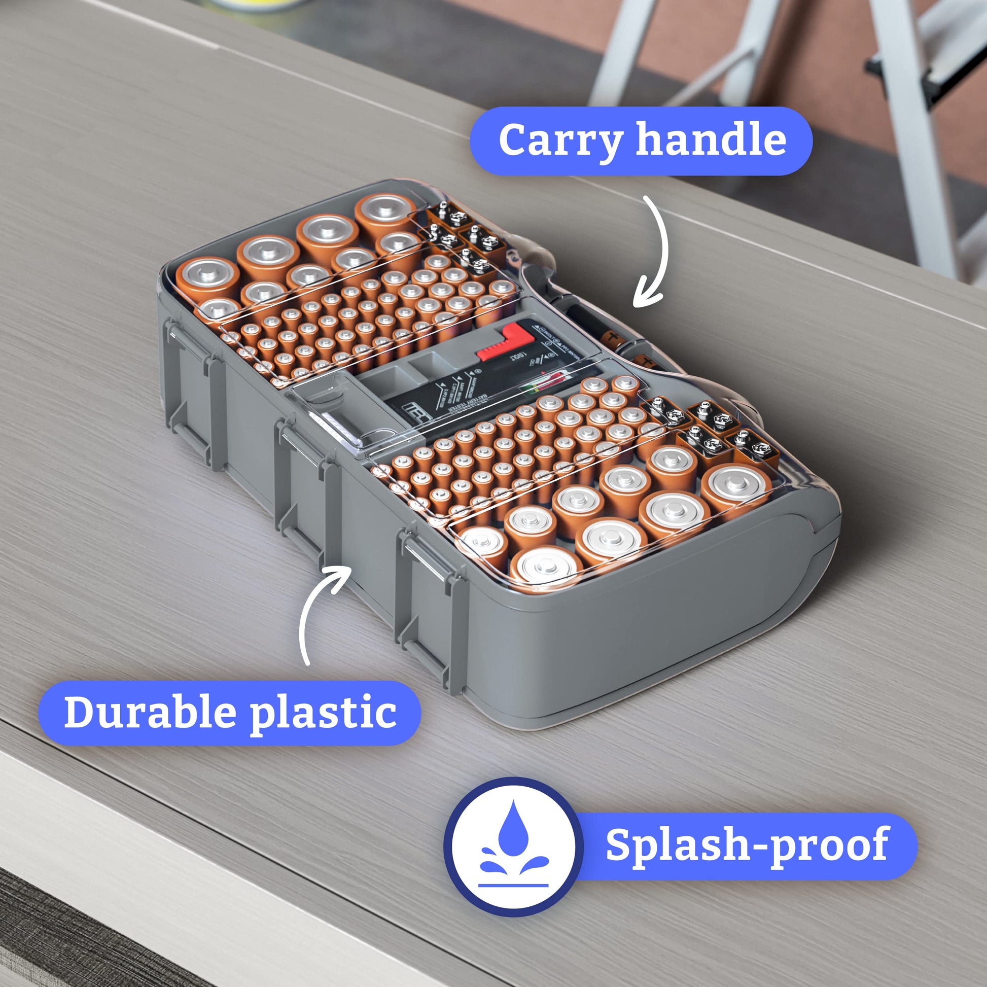 THE BATTERY ORGANISER Storage Case with Tester, Stores & Protects Up to 180 Batteries, Hinge Clear Cover with Locking Lid, Garage Gadget Organization Holds AA AAA C D and More, Gray