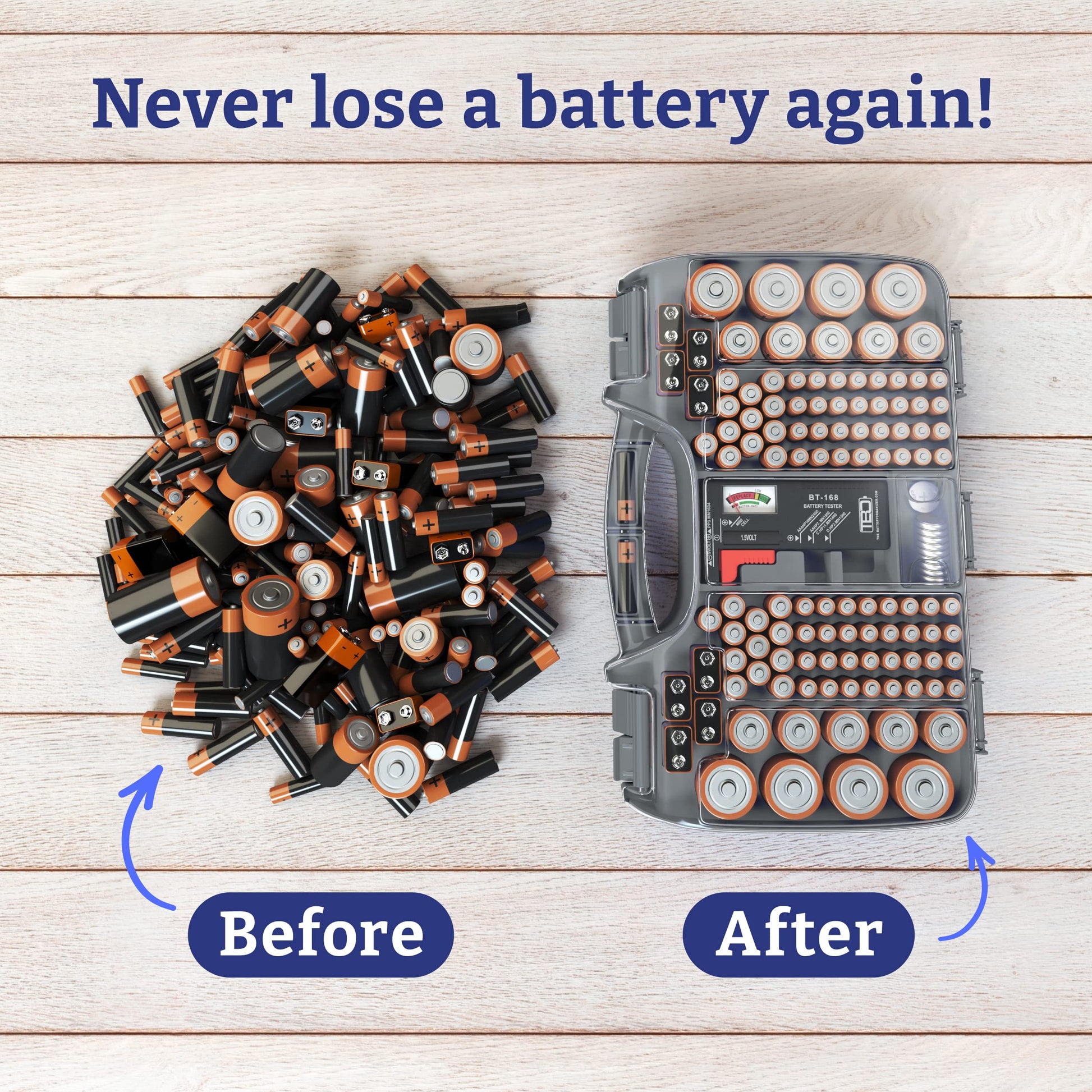 Details: Great item to eliminate your cluttered drawers and closets. Helps keep your batteries neat and organized! also includes a battery tester that you can easily remove. The tester doesn't require any batteries for operation. It works on the power of the battery you are testing! you can store it conveniently in your drawer, closet or you can mount it on the wall. Stores up to 180 batteries (not included): 78 AA batteries, 64 AAA batteries, eight 9V batteries, 10 C batteries, eight D batteries, and 12 flat batteries.
