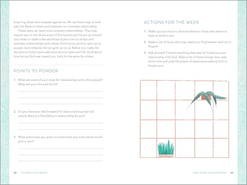 Details: Strengthen your faith week by week with this yearlong journey through the Bible for women―Now a USA Today bestseller! When you need to lift your spirits or tackle life's challenges, the Bible is always there to offer guidance. This inspiring Bible study for women combines a daily reading plan with weekly opportunities to reflect, discuss, and explore how God's wisdom can be applied to your daily life. The unique approach goes beyond other Christian books for women with: Themed readings for women―All verses for a given week tie together with themes that relate to modern women, like persevering through challenges, moving on from mistakes, and more. Your favorite translation―The included reading plans work with any translation, allowing you to use your favorite Bible to connect with God more deeply. Many ways to study―Explore the interactive questions, Bible journaling prompts, and prayers on your own or in a group setting of any denomination with The Bible in 52 Weeks. Don't forget the companion book―Use this bestselling Bible study alongside Small Group Workbook: The Bible in 52 Weeks for Women and practice your faith with friends and loved ones! Get to know the Word in a new light and strengthen your relationship with Christ in The Bible in 52 Weeks.