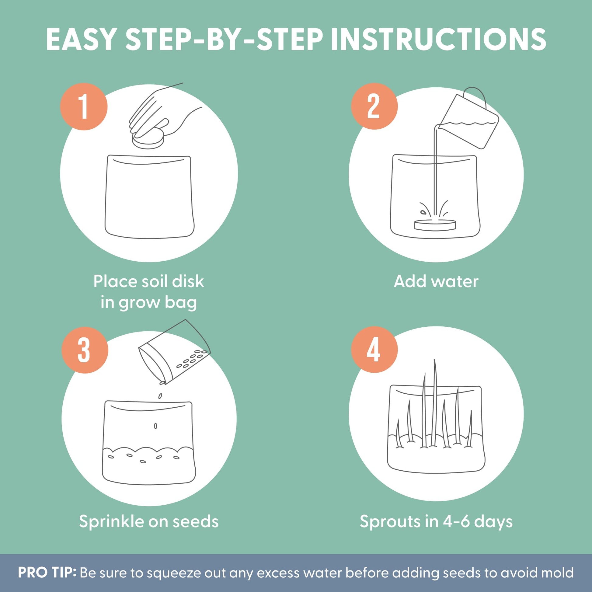 • What’s Inside: Our Cat Grass Growing Kit includes 3 USA-made grow bags (4.7” x 5.5” x 6.1”), 3 soil disks (number may vary), organic seeds for planting edible grass, and simple instructions.