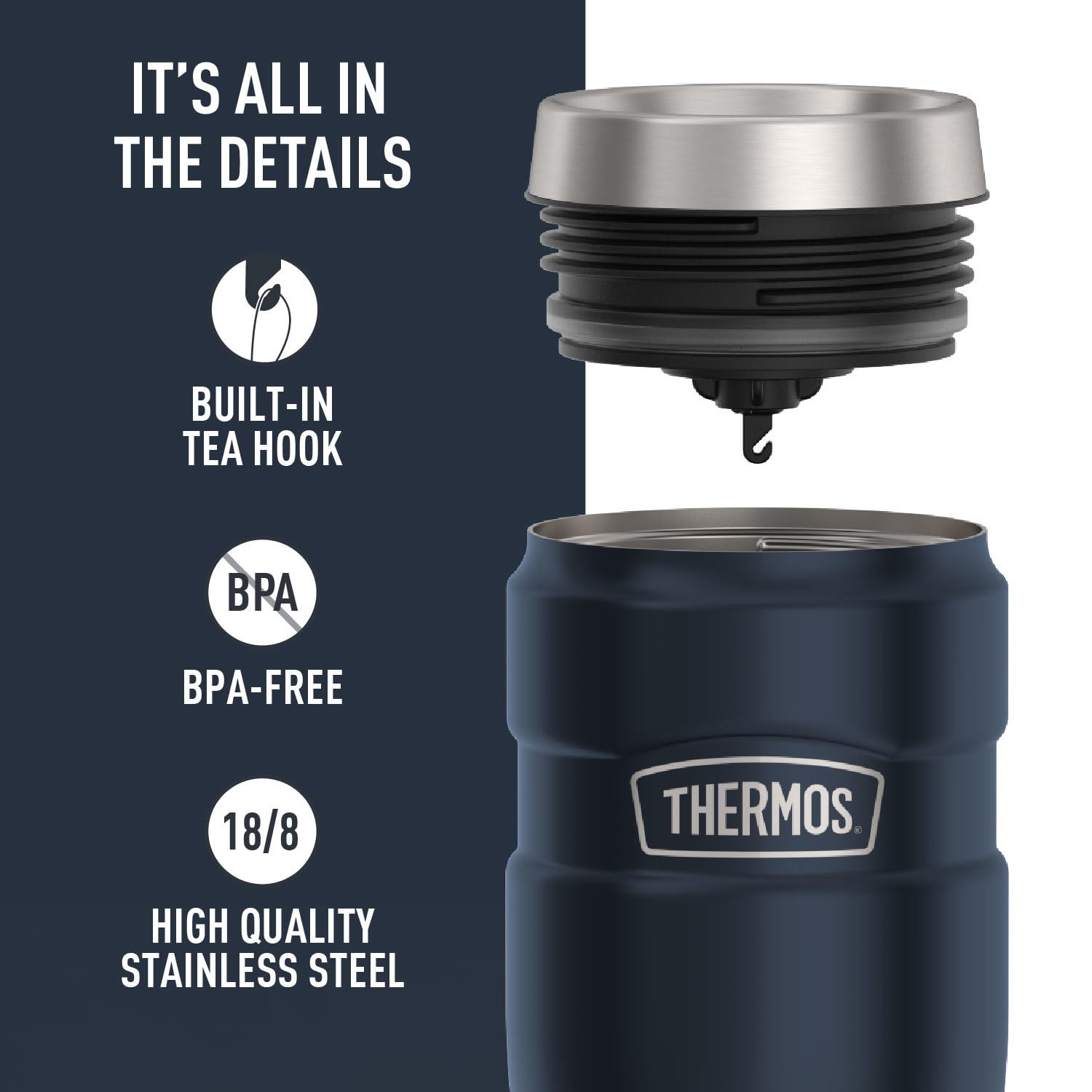Details: This rough and tumble stainless steel travel mug is great for long treks or long road trips—to the wilderness or across town. The perfect travel companion. The STAINLESS KING Travel Mug is durable, dependable, and designed for the long haul. Keeps your morning coffee or tea hot for up to 7 hours and iced drinks cold for up to 18 hours. The DRINKLOCK sealing lid is leak-proof when closed for peace of mind. Features a built-in tea hook that holds tea bags or most loose leaf infusers. Exterior stays cool to the touch with hot beverages and sweat-proof with cold. THERMOS brand mugs are dishwasher safe, top rack recommended.