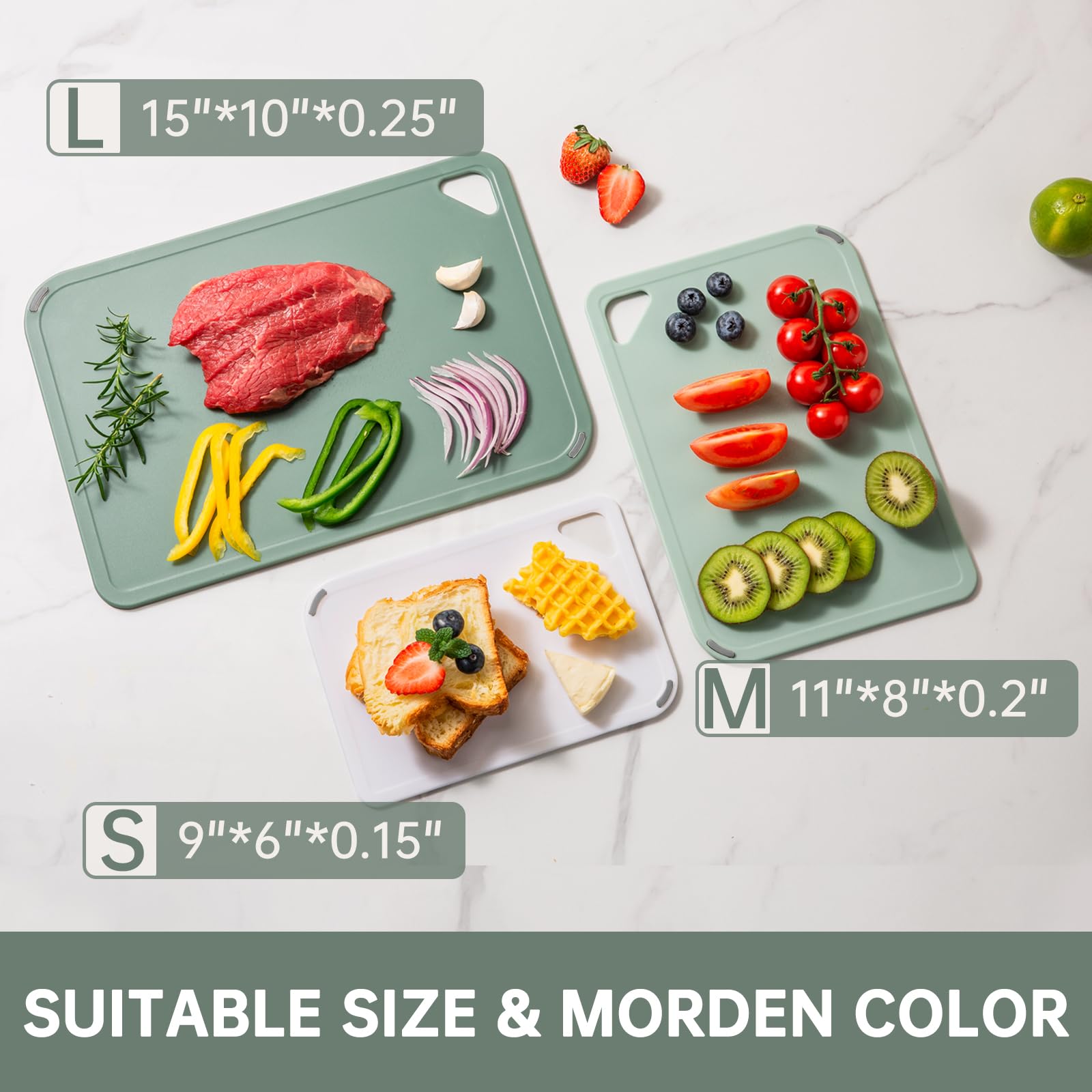 • DOUBLE-SIDED REVERSIBLE, DOUBLE ANTI-SLIP: Our kitchen set is equipped with high-quality rubber anti-slip feet on both sides to fix the cutting board on the kitchen countertop. No matter which side you use, the BPA-free cutting boards is stable and safe. In addition, one side is designed with a unique anti-slip particle area. Whether it is cutting raw meat or fish, there is no pressure, making cutting easier and safer!