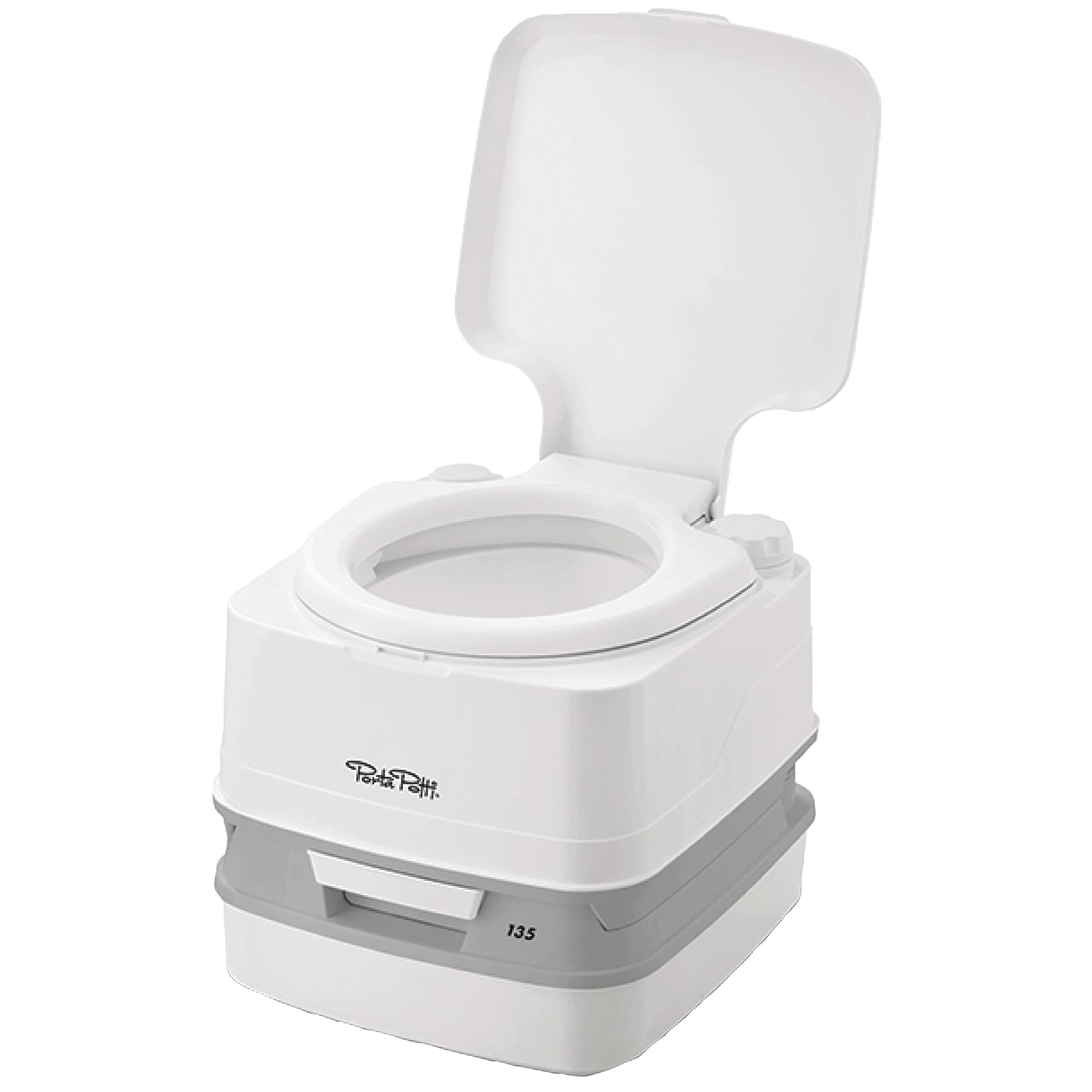 Details: Durable and compact, Porta Potti 135 portable toilet makes an ideal companion whenever you're on the road. Works in RVs, trucks, vans or even when you're out camping, offering the comfort of a fully functional toilet. 135 model uses a bellows pump for flushing and comes with removable seat and cover for easy cleaning. The portable toilet has two holding tanks: a 2. 6 gallons (9. 8l) fresh water tank and a 2. 6 gallons (9. 8l) wastewater holding tank. The freshwater tank ensures an average of 27 flushes, with a full tank. The wastewater holding tank comes with a sealed valve, which prevents odors from escaping, and the exclusive Pour-Out Spout, which ensures there's no backsplash during the emptying process. The portable toilet has white top and bottom with a grey middle-band and has the following dimensions: H: 15. 12 in (38. 4 cm) - from top to bottom - lid closed, L: 13. 54 in (34. 4 cm) - from front to back, W: 12. 13 in (30. 8 cm) - from side to side. Caution: Do not use stiff brushes or homemade products to clean or lubricate the valve and seal of your portable toilet, as these will damage the seals and surfaces, causing odors to escape from holding tanks