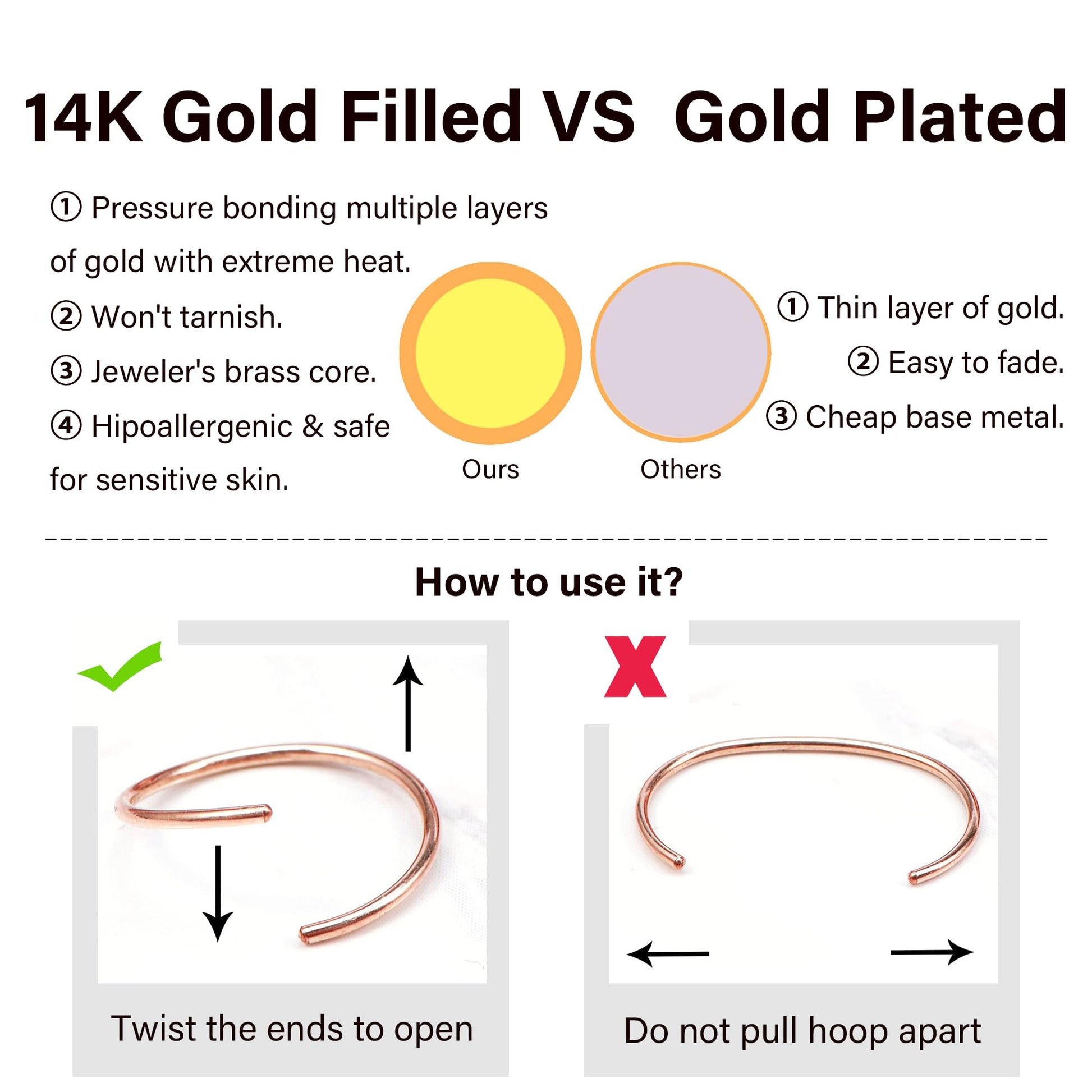 • 【14K Gold Filled Nose Ring Hoop】: This nose ring hoops for women is made of 14k gold filled, nickel-free and lead-free, making it hypoallergenic for sensitive skin people. And you can wear it for a long time without fading.