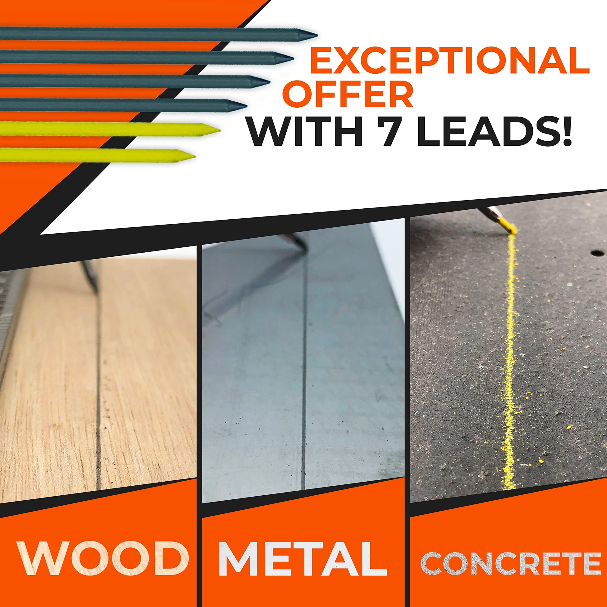 • WORKPACK: 1 PENCIL AND 6 LEADS INCLUDED! Do you have plenty of work to do? Don't panic, a box of 6 leads is included with the carpenter pencil, which makes a total of 7 leads! You will receive 1 gray lead in the construction pencil + 4 gray and 2 yellow leads in the refill pack. Take advantage of our 30-days money back guarantee. Go for the big jobs!