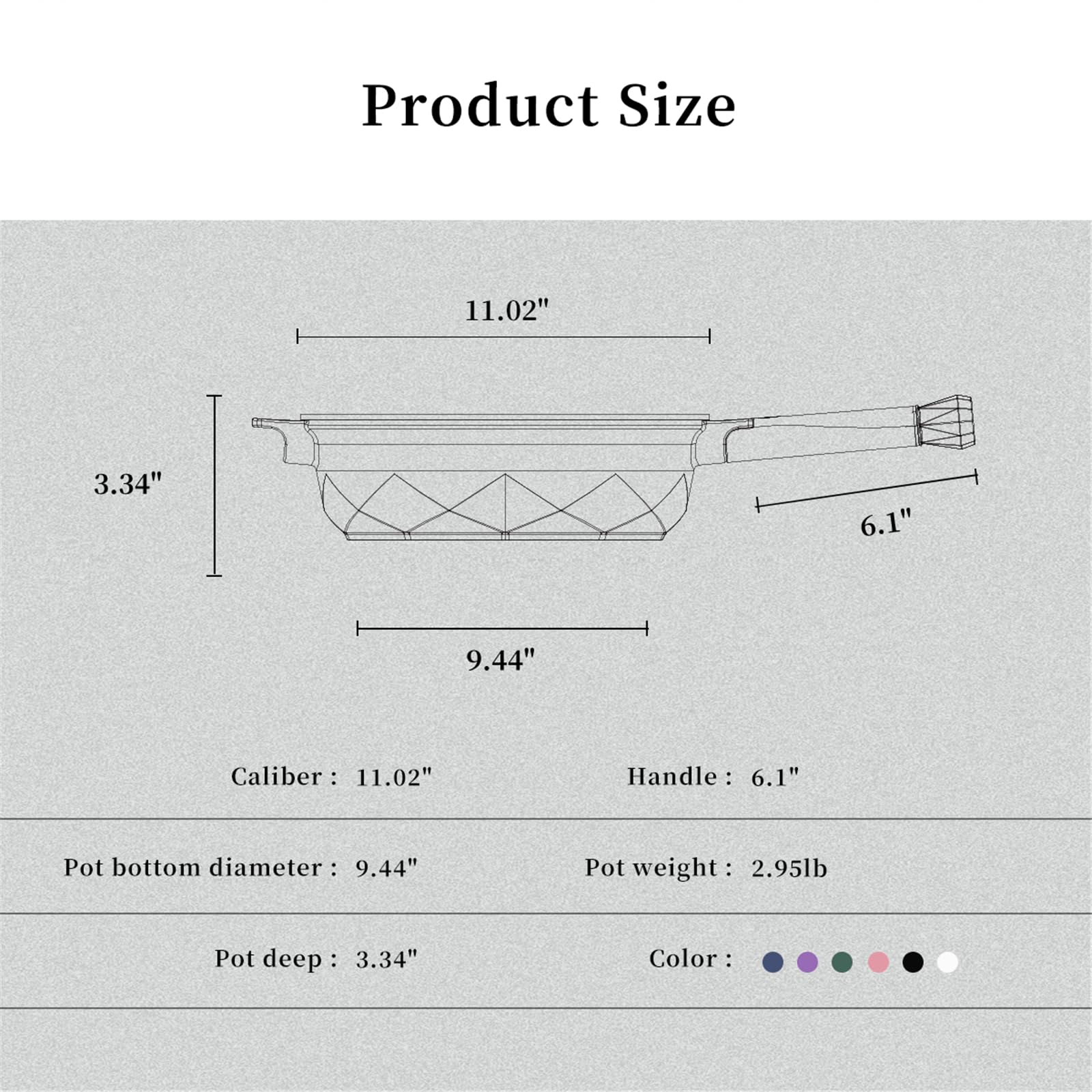 • Package & Size: Package: 1 x 5 qt All In One Pan,1 x Packaging Box,1 x Pot Lid,1 x Silicone Spatula,1 x non-stick wok steamer grid,1 x Non-stick silicone pad,1 x User/Recipe Guides,Size:28 x 24 x 8.5cm/11' x 9.4' x 3.3'(Top Dia*Bottom Dia*H)