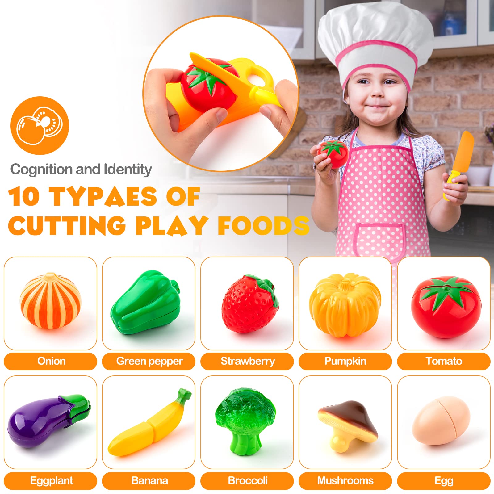 • HIGH-QUALITY & SAFE: Kitchen Pretend Play Toys are made of high-quality materials and thick safe and environment-friendly materials. The cut food is non-toxic, odorless, and bright colors, round edge design tested to be safe for kids. Perfect size for kids, toddlers and children in their pretend play kitchen.