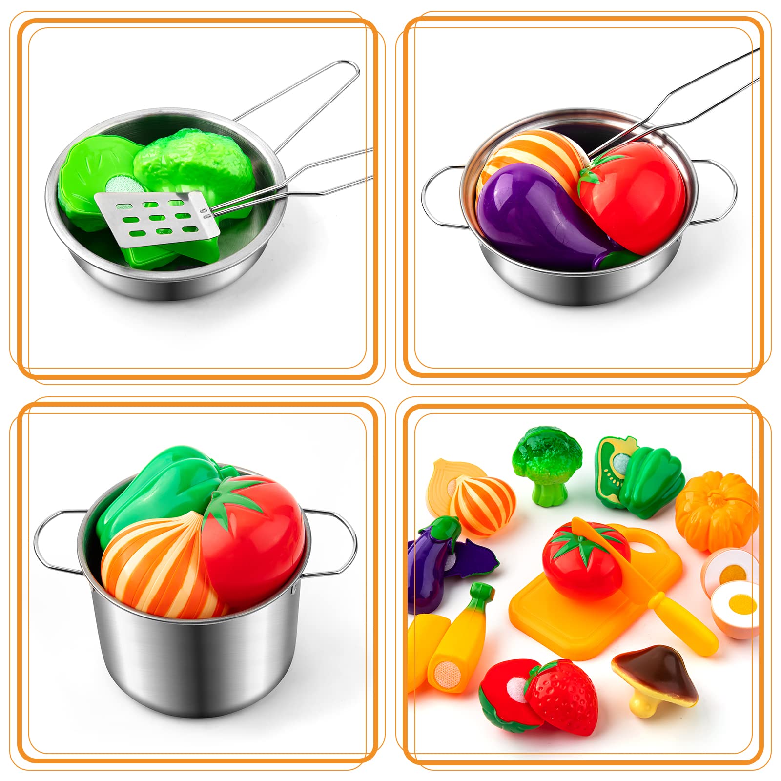 • KIDS KITCHEN TOYS SET: 26 pieces in total, include 4 stainless steel pots and pans set(a colander, pot holder,stainless steel pots and pans with Lid and Handles), a Wooden Utensils, Apron & Chef Hat and pretend food cutting vegetable toys. Perfect for kids pretend play and role play.