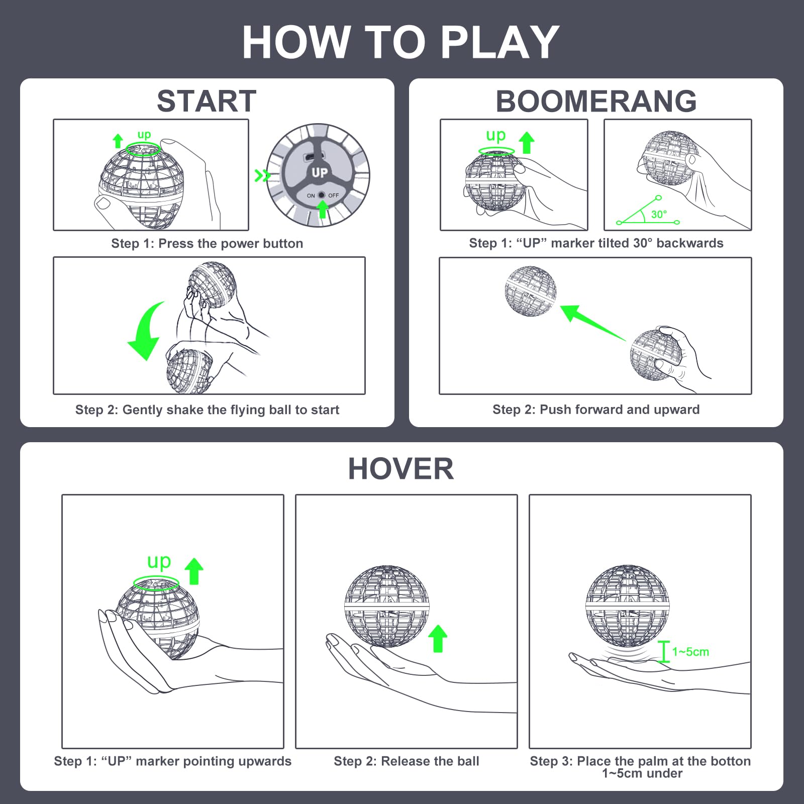 • Super Cool High-Tech Hand Controlled Drone : Our flying orb ball featuring a gyroscope and smart AI chip that promises intelligent flight. Different throwing angles and speeds will create different flight lines and boomerang effect. This cool stuff not only brings fun to play but also helps to improve children's hands-on ability, operating skills, intelligence, and creativity.