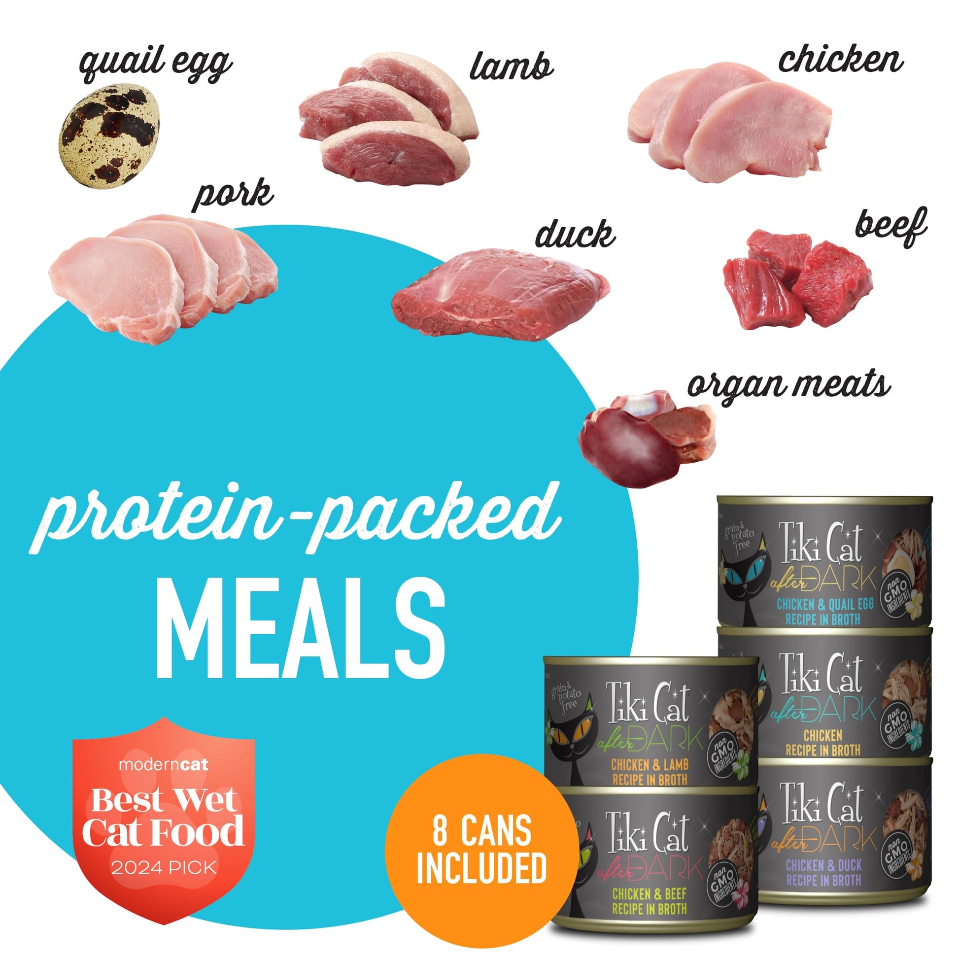 Details: Tiki Cat® After Dark™ Wet Cat Food is mouthwatering, hearty meals of shredded chicken and nutrient-rich organ meat.