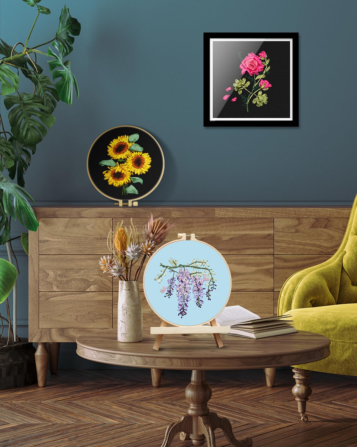 • 【What Will You Get】1* embroidery hoop, 3* embroidery fabric with pattern, 3 set of enough Silk Ribbon, 6* embroidery needles, 3* instructions, 1* scissor, 1* needle threaders, 1* Seam ripper.