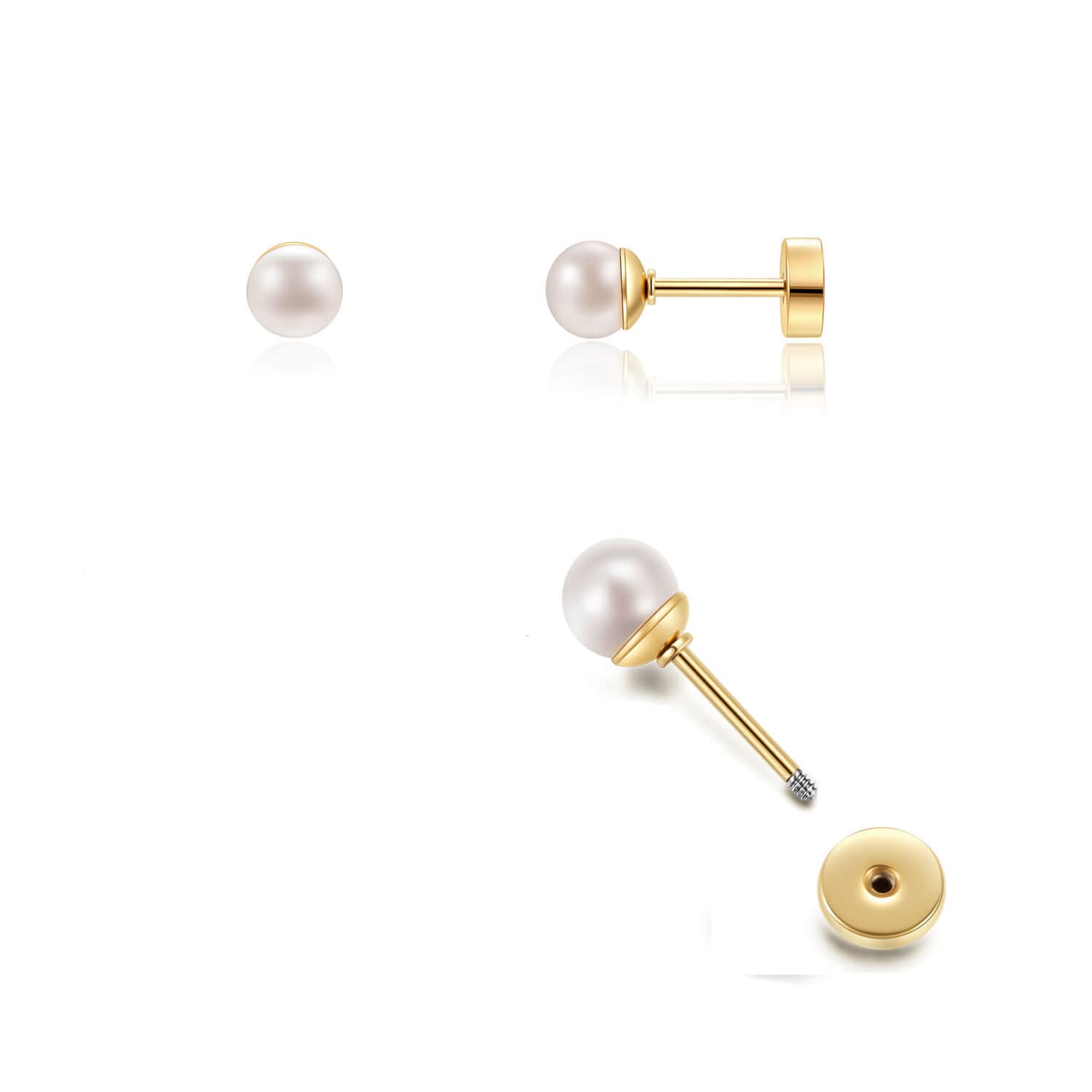 Tiny Pearl Screw Back Stud Earrings for Women,Safety Flatback Pearl Cartilage Helix Earrings 316L Surgical Stainess Steel Jewelry Gift For Toddlers Hypoallergenic(4mm Pearl, Gold)
