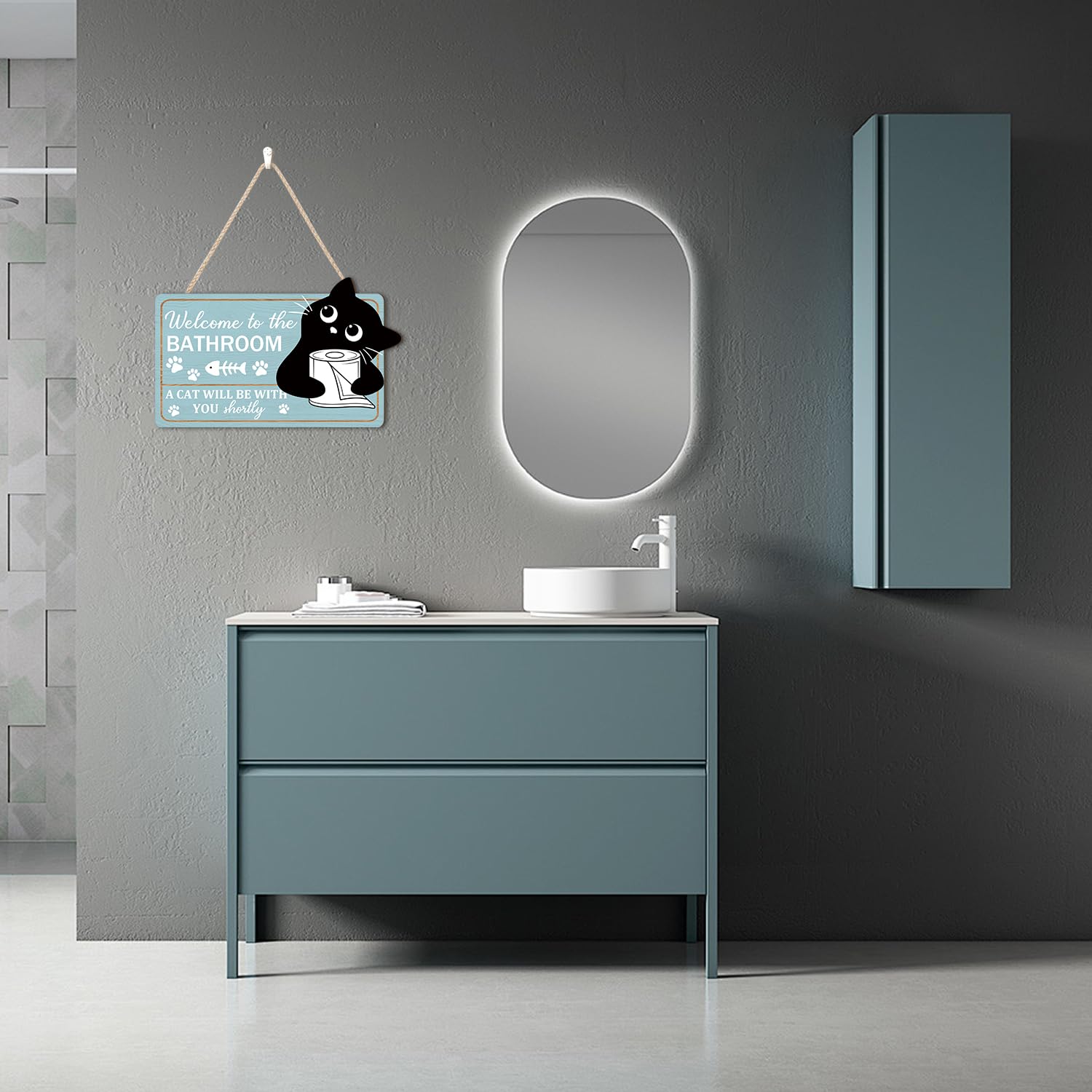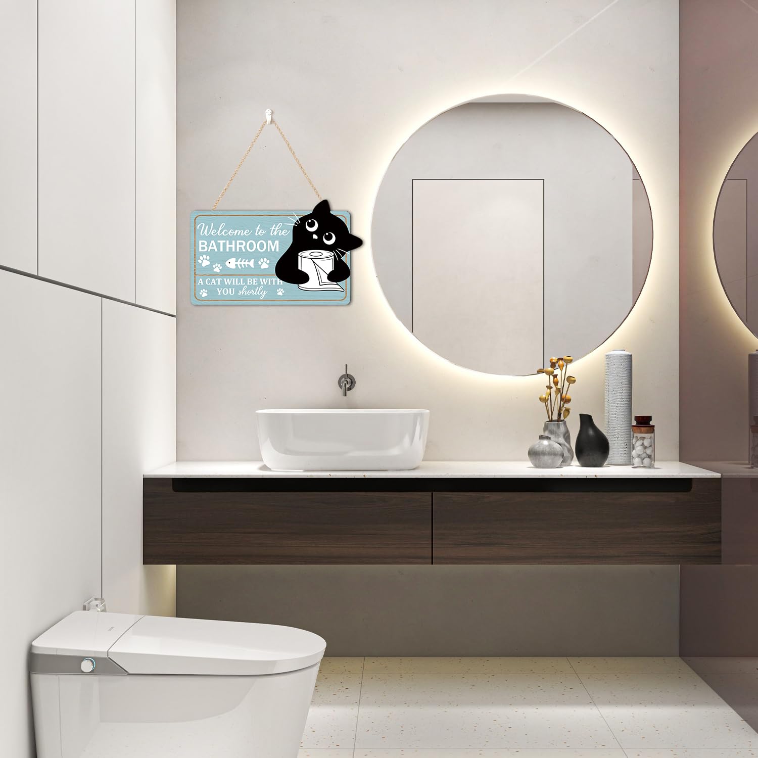 • Funny bathroom quote Welcome to The Bathroom A Cat Will Be with You Shortly hanging sign is made of high quality wood board laser printing, it is thicker than ordinary metal, plastic and other materials, and can be stored for a long time.