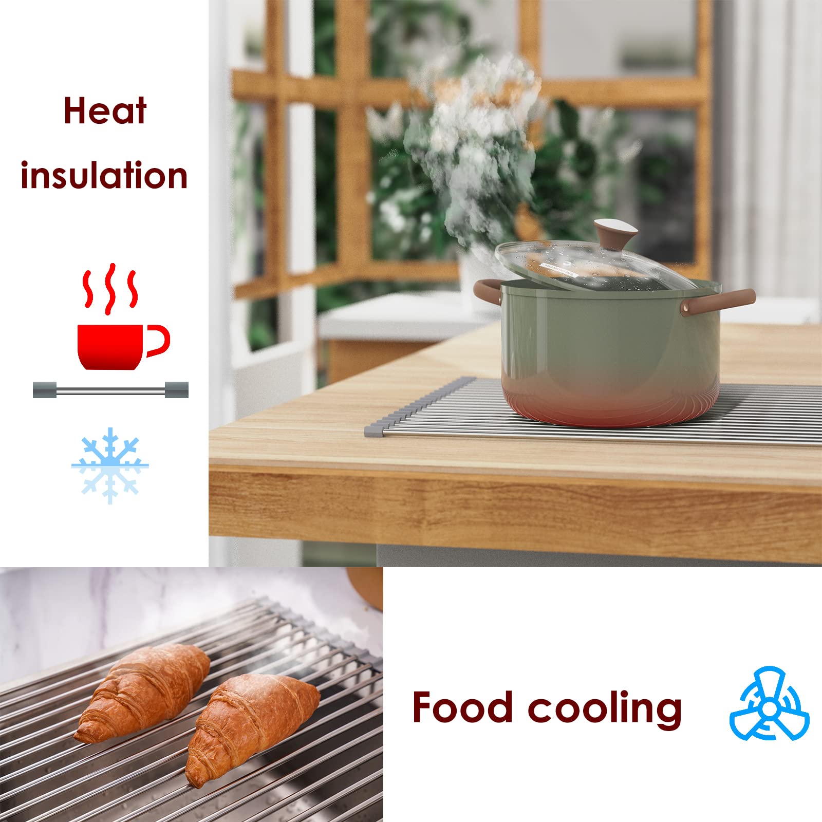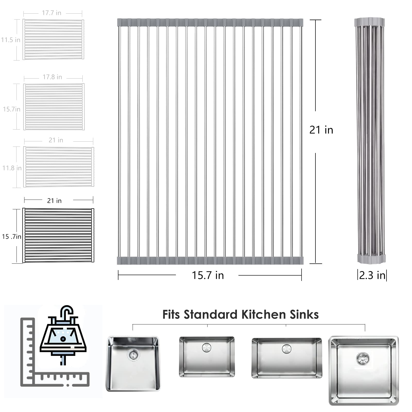 Tomorotec Roll Up Dish Drying Rack Over The Sink Grey Large Dish Drying Rack Rolling Foldable Collapsible SUS304 Stainless Steel Multipurpose Dish Drainer for Kitchen Counter (21”x15.7”)