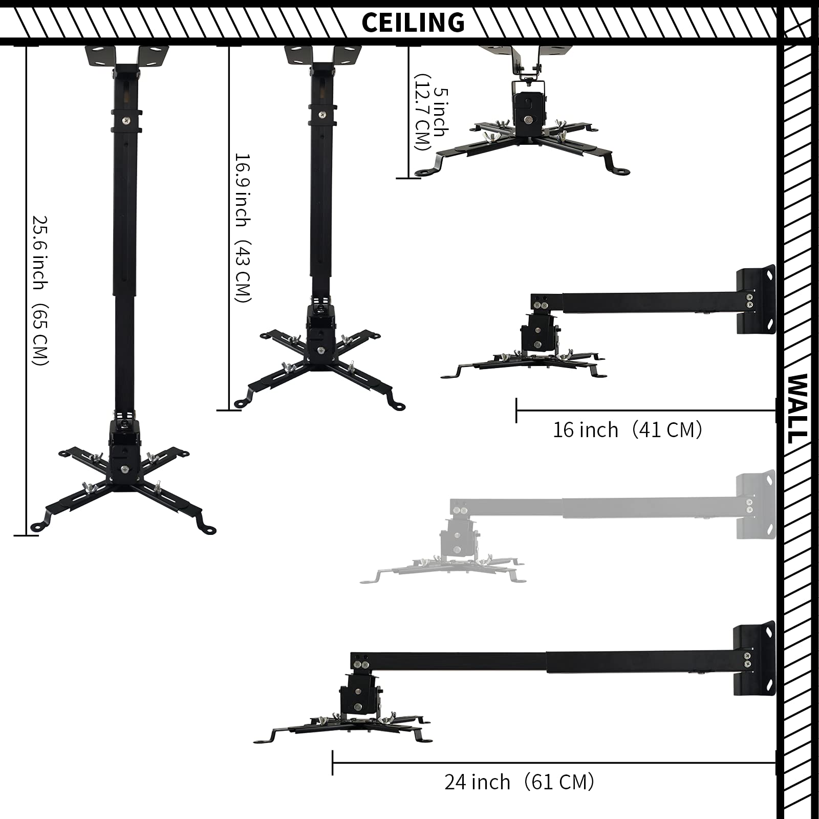 • 【EASY TO ADJUST】The projector holder is fully adjustable with +/- 30 degree tilt, +/-30 degree swivel, hitting all the right viewing angles. The projector ceiling mount adjustable height extends from 16.9' to 25.6' from the ceiling surface and 13.8' to 22.5' from the wall. Flush ceiling mount with a minimum length of 5 inches.
