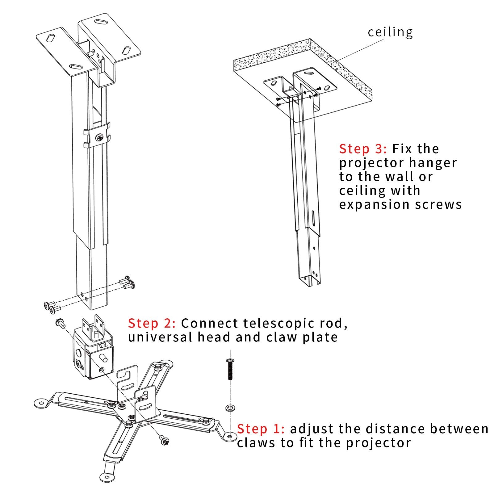 • 【EASY TO INSTALL】Projector mount ceiling adjustable is easy installation with quick release hooks that attach and detach by tightening and loosening mounting bolts. All necessary hardwares and instructions are provided for assembly. NOTE: This projector screen ceiling mount does NOT support the vaulted ceiling and regular drywall.