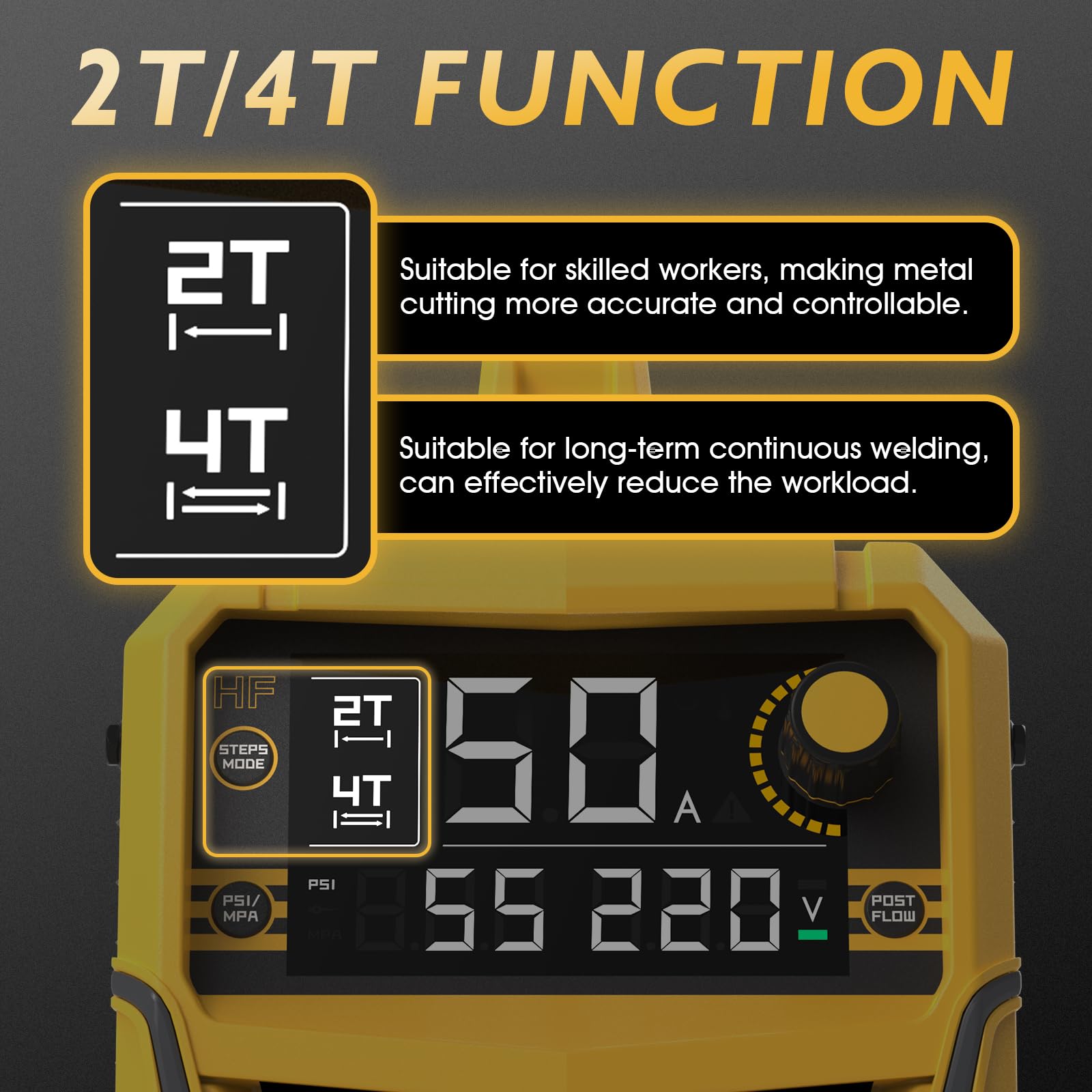 • Post-flow time can adjust from 5-8 seconds to cool welding head to extend the life of consumables. Also can select 2T/4T to have a comfortable working experience.