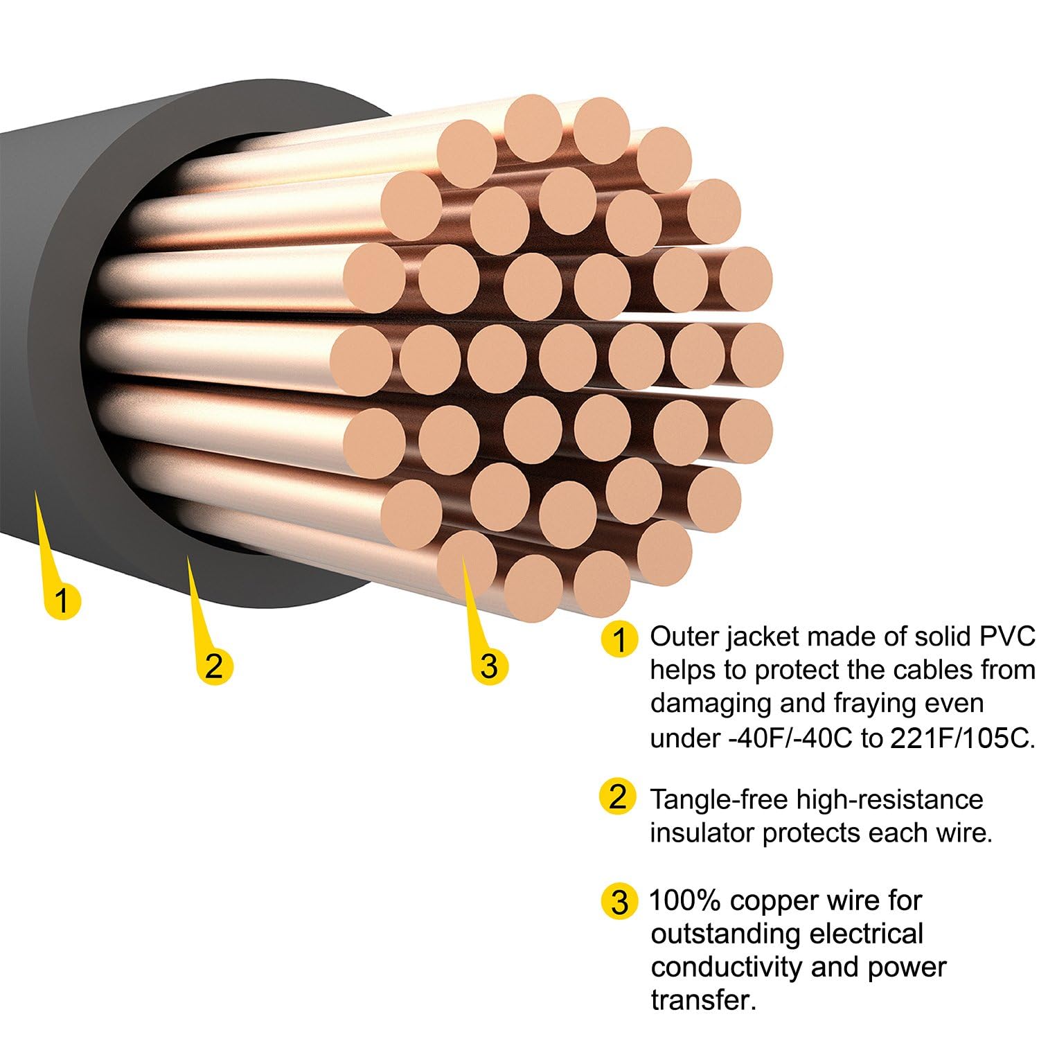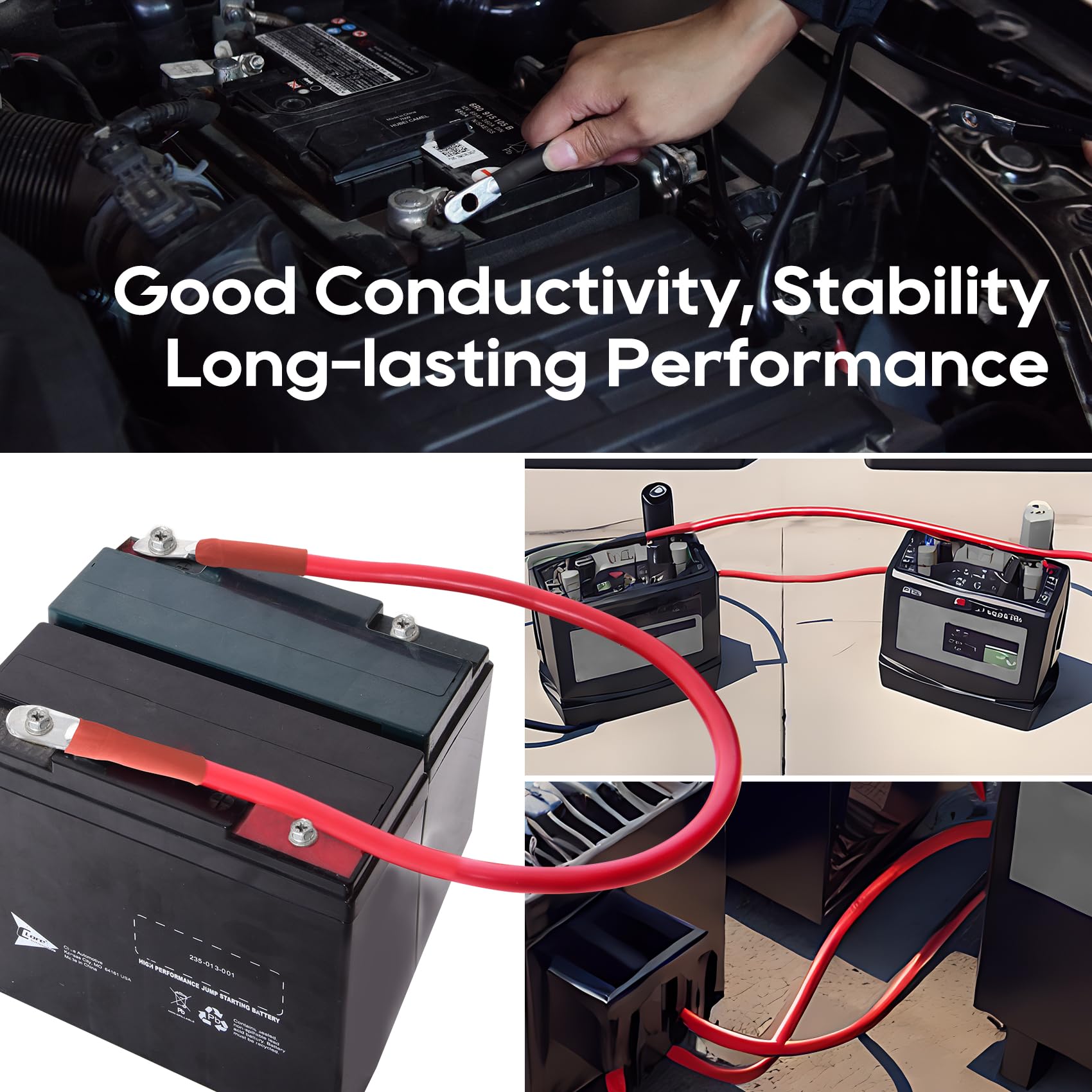 • The 4 gauge battery cable is made of pure copper, which has excellent conductivity, ensuring minimal power loss and extending the service life of the equipment