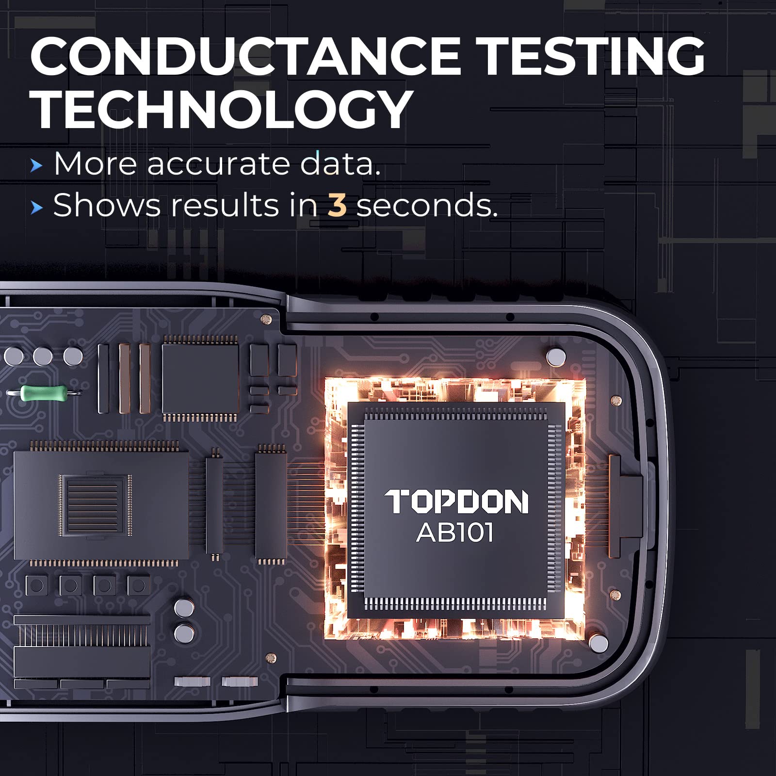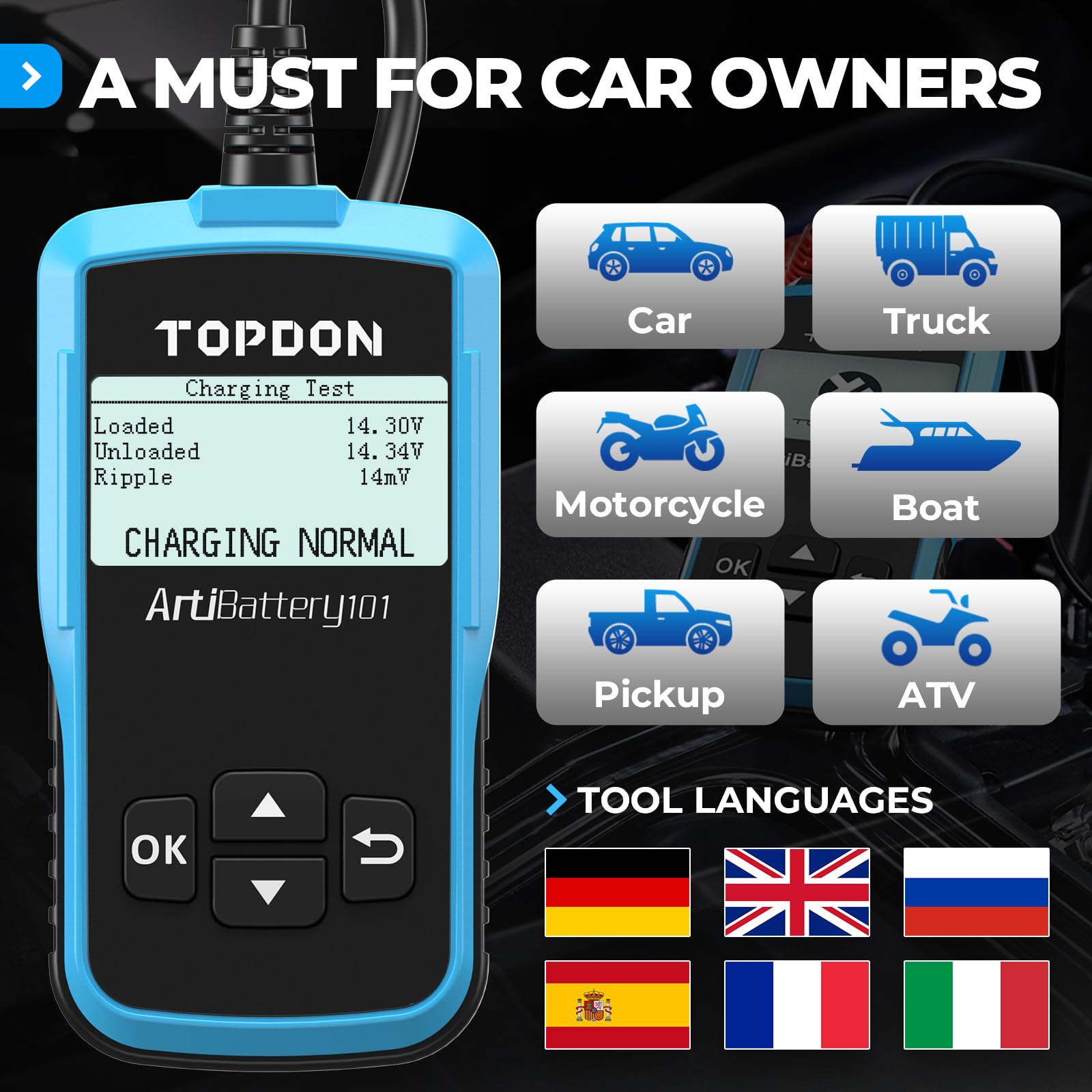 TOPDON AB101 Car Battery Tester 12V Car Battery Load Tester on Cranking Charging Systems, 100-2000 CCA Automotive Alternator Analyzer for Cars/SUVs/Light Trucks with Flooded AGM Gel Types
