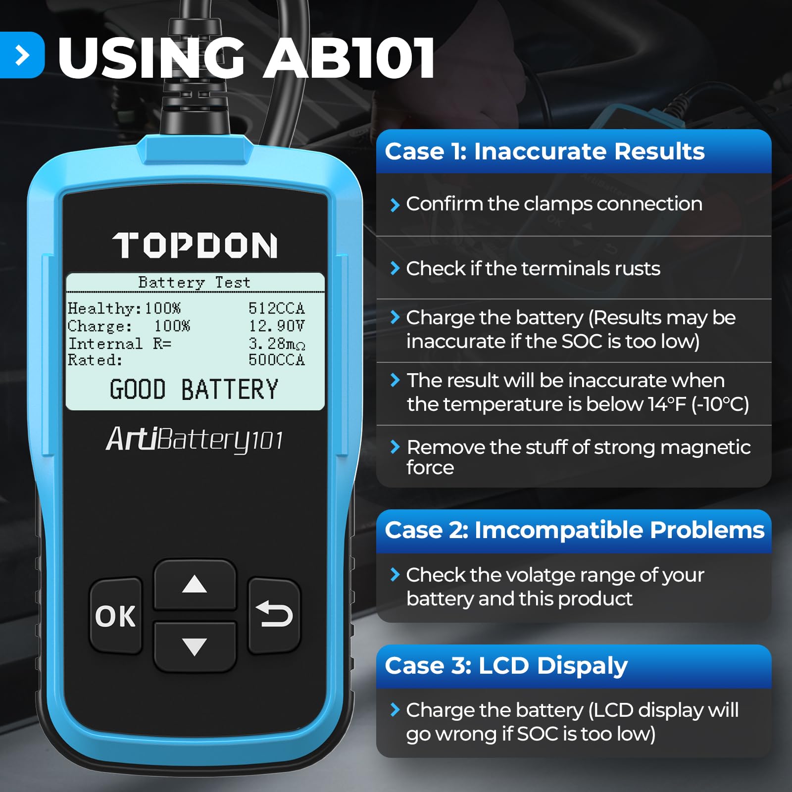 • BATTERY HEALTH TEST ➤ AB101 car battery tester is highly recommended by Scotty Kilmer and BestReviews. By directly benchmarking the battery health, this battery analyzer gives advice on whether to replace the battery. Besides, the cranking and charging system tests are also included.